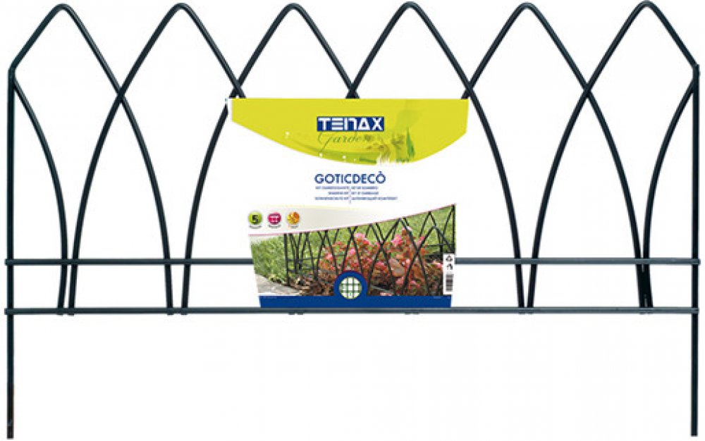 Hraniční gotický oblouk sloužící definování, držení a zároveň zkrášlení trávníků a záhonů. Lze ho jednoduše instalovat kolem záhonů různých tvarů. Upravené železné díly ve tvaru lomených oblouků jsou velmi pevné a trvanlivé. Vhodný doplňěk zahrad s ustáleným charakterem a nádechem historie. Vyrobeno v Itálii.