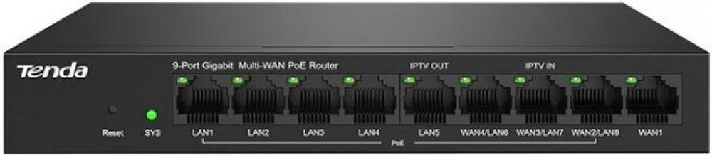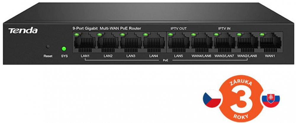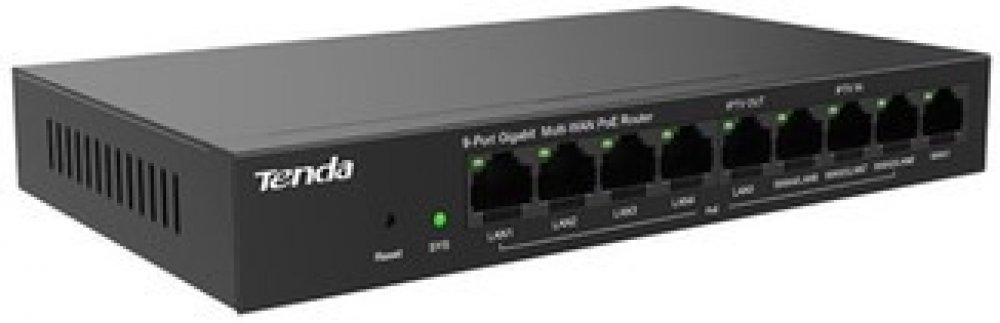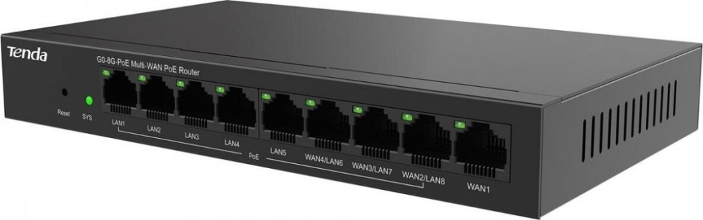 Tenda G0-8G-PoE Gigabit PoE Router je univerzálny router vrátane PoE switcha. MultiWAN, 9x Gigabit RJ45 (3x WAN/LAN, 1x WAN, 5x LAN), 8x LAN PoE+ 802.3 af/at, celkom 95W. Podporuje manažment až 128x WiFi AP Tenda i21, i24, i25, i27, i29, a ďalších. Fast Roaming IEEE 802.11k/v/r, IPSec VPN, PPTP, L2TP, Smart Bandwidth control, DHCP server.