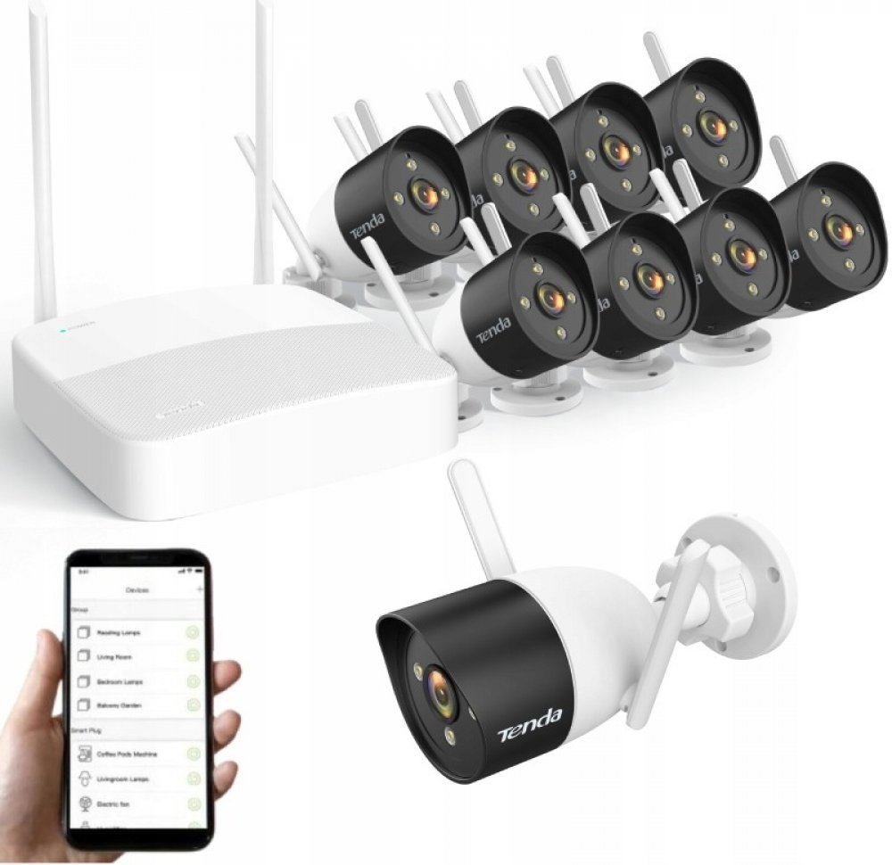 Bezdrátový kamerový Wi-Fi 2K (3MP) systém Tenda K8W-3TC (8-kanálový 2K rekordér NVR + 8 ks 2K (3MP) barevných venkovních kamer s LED svícením a podporou zvuku) a včetně veškerého příslušenství. Komprese H.265 a H.264, Cloud platforma. Voděodolné kamery IP66 s LED svícením, nočním viděním s dosahem 30 m, vestavěný mikrofon, vestavěný reproduktor a siréna, rozlišení 2K (2304 × 1296). Mobilní (Androi...