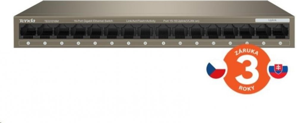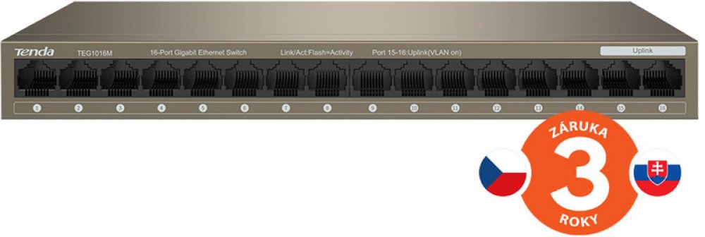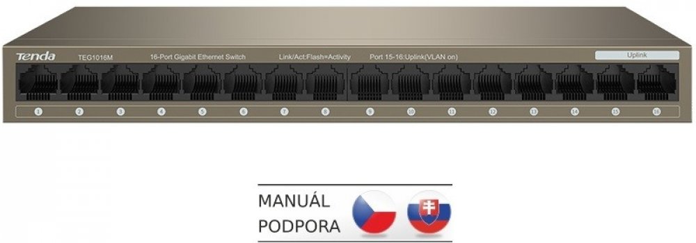 Gigabitový 16ti portový switch TEG1016M výrobce Tenda Technology, plně podporuje standardy IEEE 802.3, 802.3u, 802.3x, 802.3ab a je určený pro použití ve firmách i domácnostech.