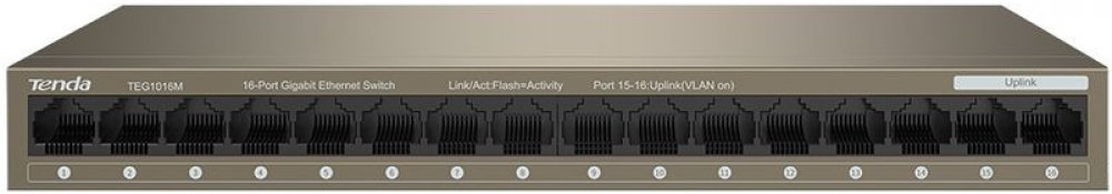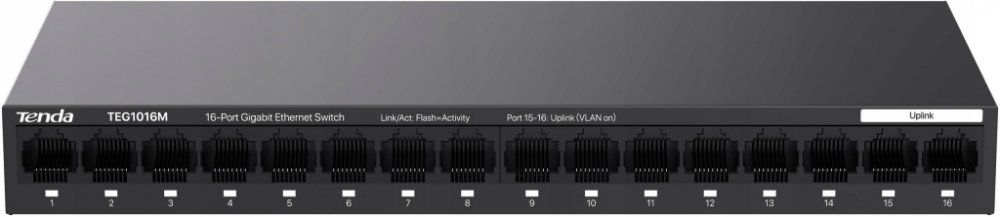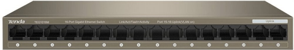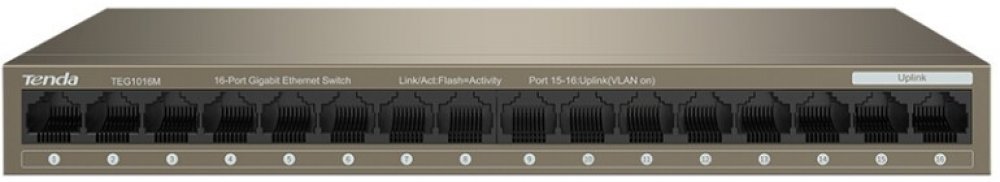 Tenda TEG1016M přepíná data v síti pomocí 16ti portů RJ45 s přenosovou rychlostí 10/100/1000 Mb/s a automatickou detekcí rychlosti. Maximální propustnost je 32 Gb/s. Auto MDI/MDIX na každém z portů. Přepojování uzlů v režimu Store-and-Forward. Full-duplex kontrola toku 802.3x. Navíc obsahuje tlačítko pro zapnutí VLAN.