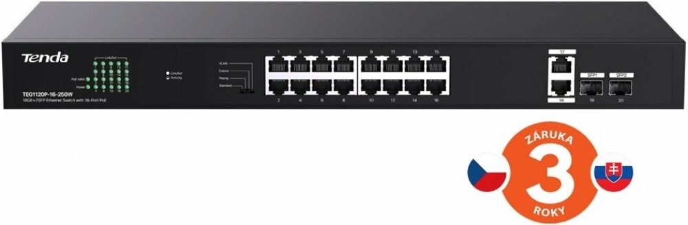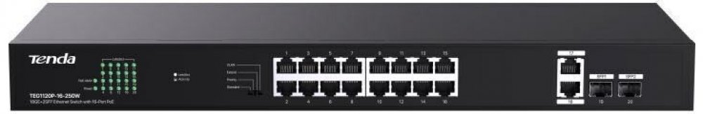 Tenda TEG1120P-16-250W Přepíná data pomocí 18ti portů RJ45 a 2x SFP sloty, 16 portů 10/100/1000 Mb/s podporuje PoE802.3af/at. Switch má ochranu proti přepětí 6kV. Podpora přepojování uzlů v módu Store-and-Forward. Full-duplex kontrola toku 802.3x, half-duplex kontrola toku v režimu Back-Pressure. Je vhodná jak do menších a středních firem, tak i do větších domácností. Napájení portů pomocí PoE 802...