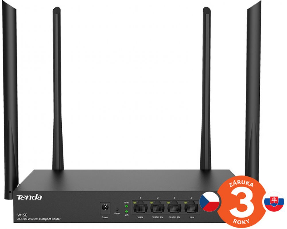 - Obsah balení: 1x Tenda W15E, 1x Stručná instalační příručka (CZ, SK, PL, EN, atd.), 1x Napájecí adaptér (9V DC, 1000 mA)