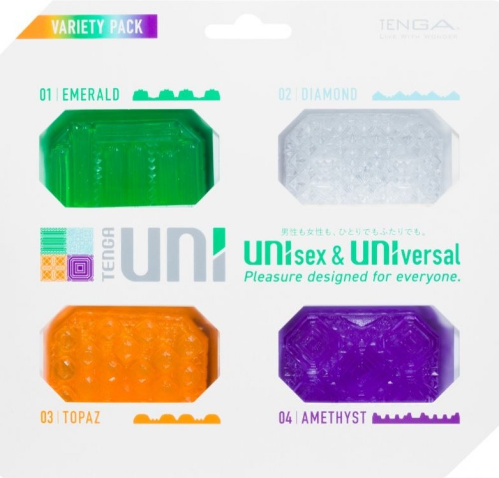 UNIsex a UNIVERSAL 4 pružné, měkké masturbátory v UNI Variety Package od Tenga s různými stimulujícími texturami: smaragd, diamant, topaz a ametyst. Každý návlek lze také použít jako stimulační návlek na prsty Každý návlek má hladkou stranu a stimulující texturu na druhé straně pro intenzivní masáž, zejména penisu a vagíny. Hedvábný, ultraflexibilní návlek lze snadno otočit naruby a používá se spolu s přiloženým lubrikantem při ruční práci nebo prstokladu. 4 kusy každý na jedno použití. Celková délka každého 6 cm (vysoce natahovací). TPE.