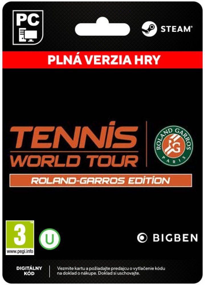 Tennis World Tour Roland Garros Editionobsahuje: hru Tennis World Tour vydanouv roce 2018 s 12 aktualizacemi opět nebudou chybět známá tenisová jména jako Roger Federer, Gaël Monfils, Angelique Kerber, Garbine Muguruza a další. Dohromadyvíce jak třiceti tenistů nové hlavní kurty Roland-Garros: Philippe-Chartrier, Suzanne-Lenglen a Simonne-Mathieu, Centrální dvůr Mutua Madrid Open a La Caja Magica veškeré bonusy z předchozí Legends Edition, které zahrnují hráče André Agassi a John McEnroe jako hratelné postavyTennis World Tour je nový milník na polisimulací, na který hráči čekají už celéroky. Federer, Monfils, Zverev, Kyrgios... Hra obsahuje hlavní hvězdy profesionální scény. Ať už jde o singly, či debly, hráči mohou hrát svým vlastním stylema stát se jedničkou v celosvětových online žebříčcích.