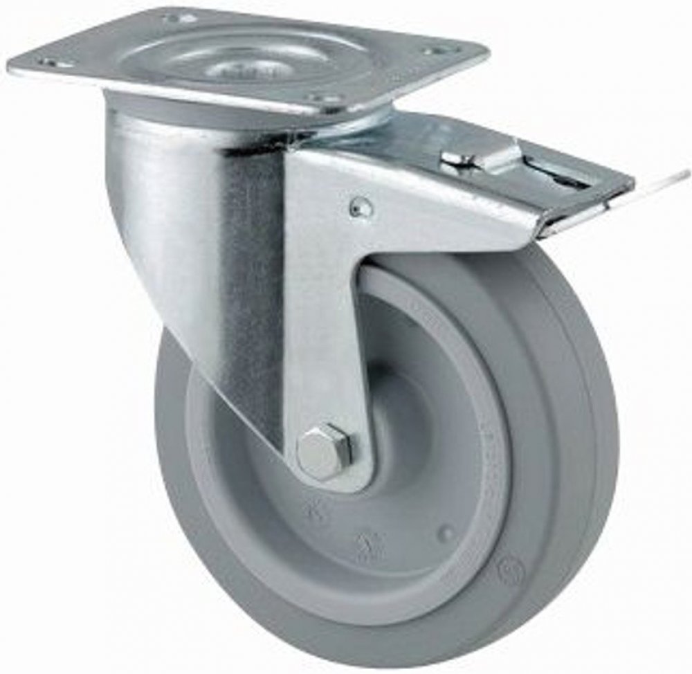 Otočné kolečko s totální brzdou, v zadní části kola, Vidlice kolečka vyrobena z ocelového výlisku, pozinkováno, dvouřadá kuličková dráha v otočné hlavě, kolo uchyceno šroubem a matkou, protivláknový kryt, uchycení s plotýnkou. Střed kola vyroben z polyamidu, elektricky vodivé, běhoun kola z polyuretanu, protivláknové kryty, přesné kuličkové ložisko.