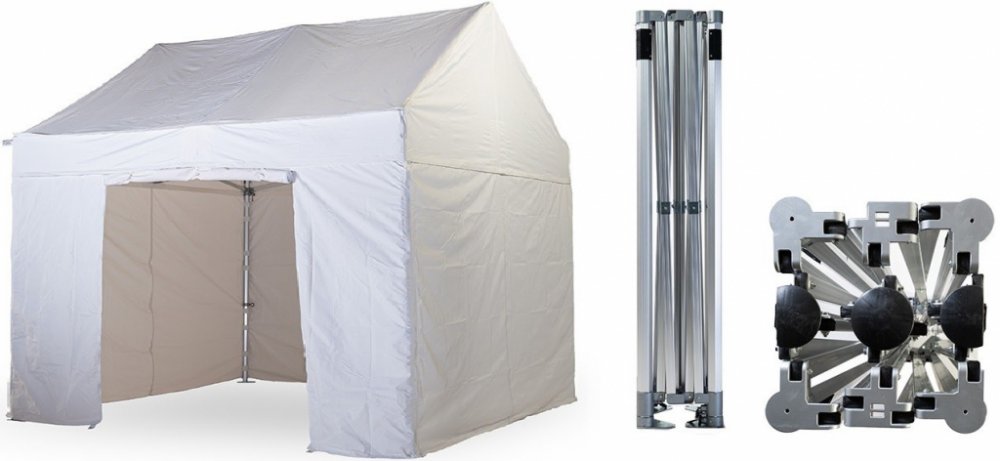• vhodný pro případy, kdy je třeba ho spojit s budovou, pergolou nebo markýzou, Ideální pro farmářské trhy