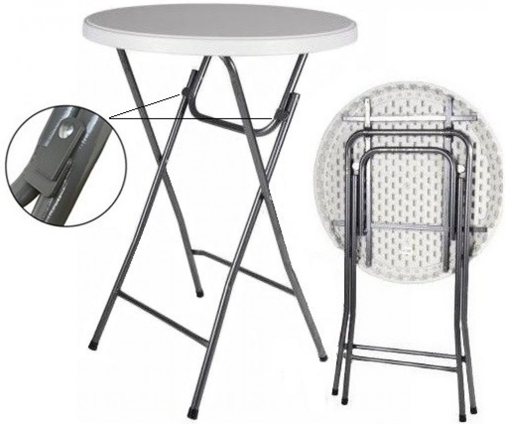 OPROTI KONKURENCI JE STŮL VYBAVEN ZÁPADKOU, KTERÁ ZABRAŇUJE SKLOPENÍ, ČI SAMOVOLNÉ ZAVŘENÍ STOLU Profesionální skládací koktejlový barový stůl, nazýván též jako „bistro stolek“,  je vhodný pro stravování až 4 osob ve stoje.