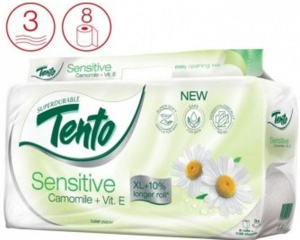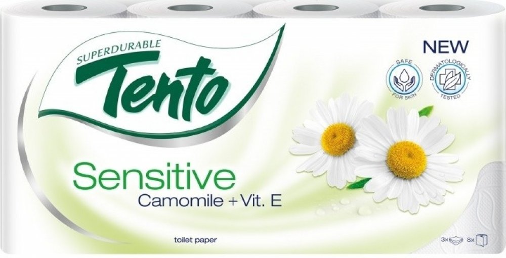 Tento Sensitive Camomile 3vrstvý toaletní papír, 8 rolí, 18 m role Prémiový třívrstvý toaletní papír nejvyšší kvality obohacený o balzám s výtažkem z heřmánku a s vitamínem E, takže je ideální pro nejcitlivější pokožku v intimních oblastech.