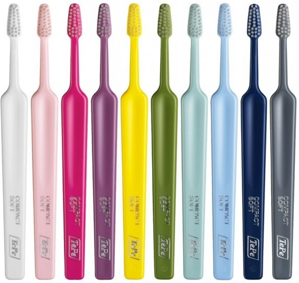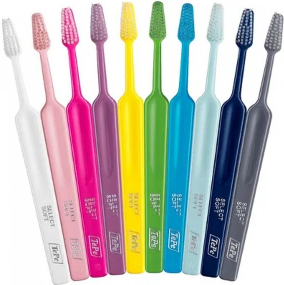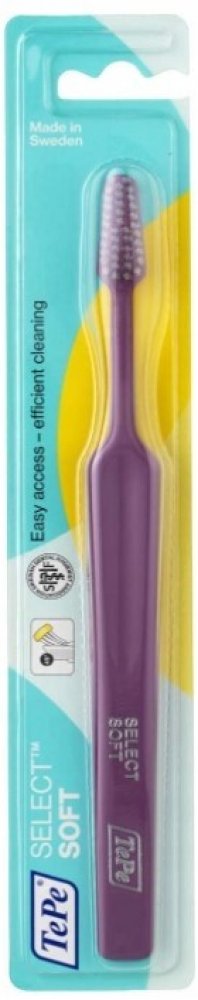 Oblíbený kartáček na zuby TePe Select Soft s malou trojúhelníkovou hlavicí, plochou rukojetí a měkkými vlákny s rovným zástřihem v decentním jednobarevném provedení.