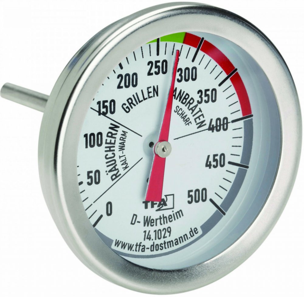 Teploměr do grilu, udírny pr. 5,2 x 6,7 cm, nerez, 14.1029. průměr: 5,2 cm výška: 6,7 cm hmotnost: 37 g materiál: nerezová ocel rozsah stupnice: 0 až 500 °C Pro kontrolu teploty varné komory. S barevně označenými rozsahy teplot (uzení / grilování / opékání). Vyrobeno z vysoce kvalitní nerezové oceli. Pro gril nebo udírnu. Jako náhradní díl, pro dovybavení nebo vlastní výrobu. Německé popisky na ciferníku. Barevně odlišené teplotní rozsahy Vám pomohou vybrat správnou teplotu pro uzení, grilování nebo opékání až do 500 °C. Teploměr je vyroben z vysoce kvalitní nerezové oceli a lze jej použít jako náhradní díl nebo jako dovybavení stávajícího grilu, udírny nebo grilovacího vozíku. Pro připevnění na víko nebo boční stěnu je nutný otvor o průměru cca 10 mm. Teploměr se jednoduše vloží do předvrtaného otvoru a připevní se zevnitř pomocí dodané matice a šroubu.