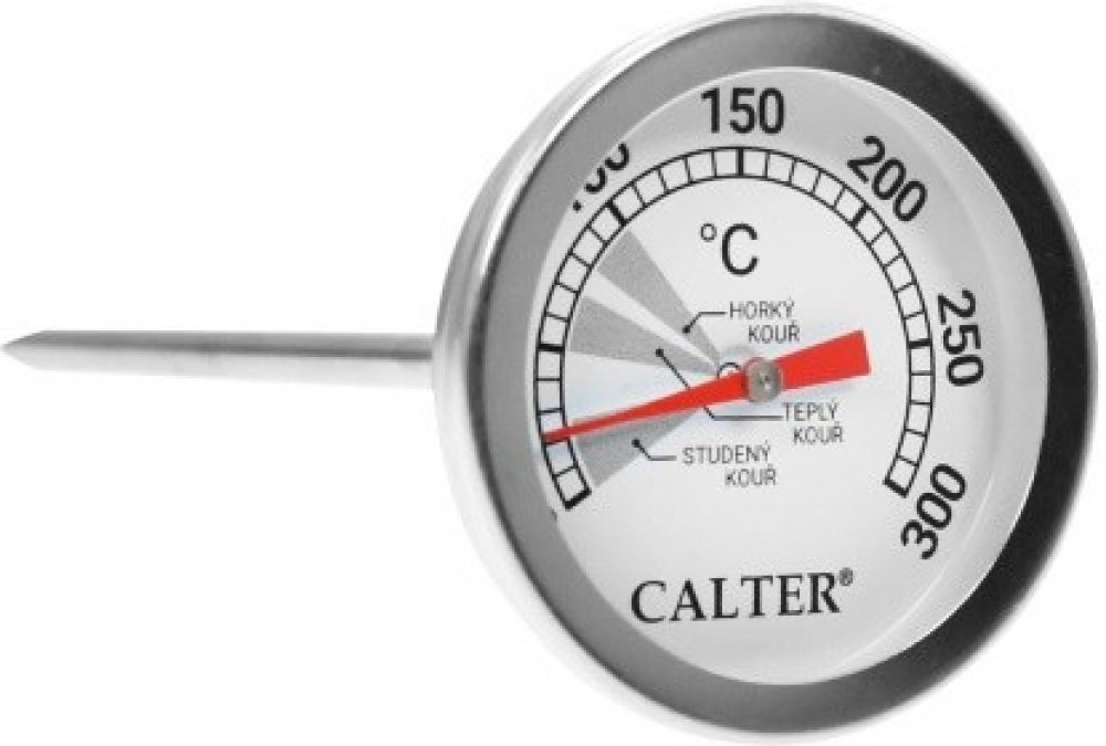 Měří teplotu od 0 do 300 °C, stupnice po 10 °C. Mezi 0-30°C udíte studeným kouřem, mezi 50-70°C udíte teplým kouřem a mezi 80-100°C udíte horkým kouřem.