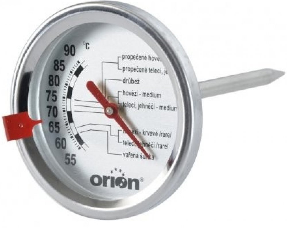 Podrobnosti o produktu OR152826 Kulatý nerezový teploměr na maso s průměrem ciferníku 6,5 cm. Měří teploty od 55 °C do 90 °C.