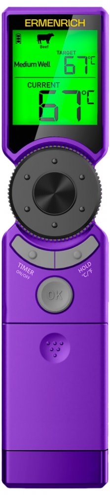Ovládání teploměru je jednoduché, protože můžete snadno přepínat mezi jednotlivými nastaveními a provádět úpravy pomocí centrálního rolovacího kolečka. Stačí jím otočit a vybrat typ a propečenost masa, nastavit cílovou teplotu nebo spustit časovač odpočítávající až 12 hodin. Teploměr vás upozorní zvukovým signálem, když je jídlo hotové nebo když vyprší nastavený časovač.