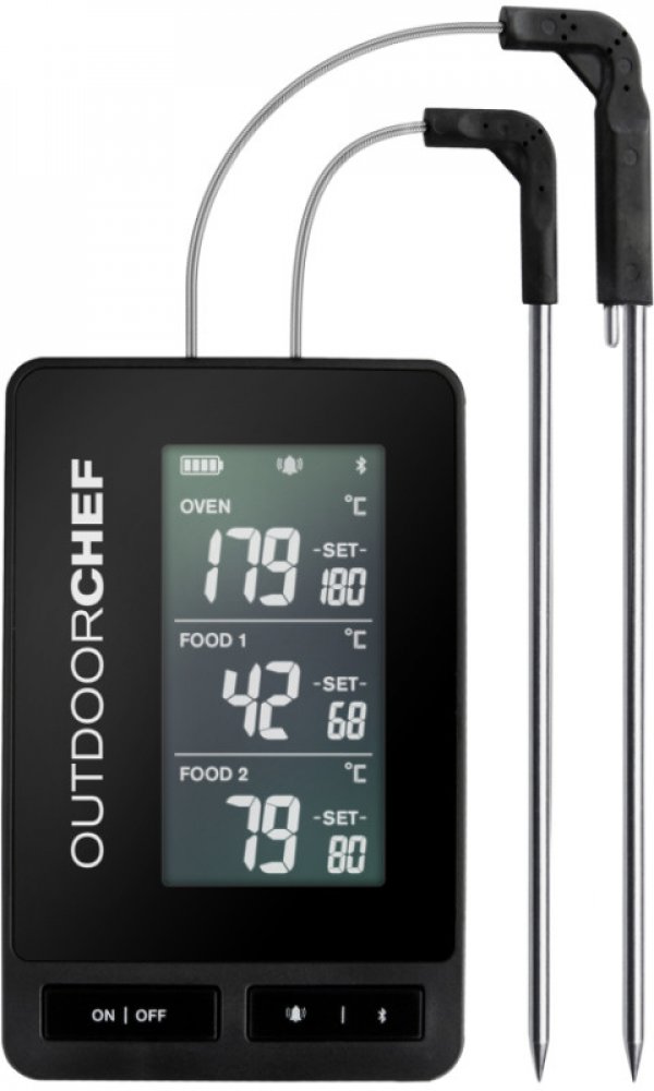 Digitální teploměr Outdoorchef se dvěma vpichovacími jehlami Gourmet Check Pro pro přesné měření teploty uvnitř masaTeploměr měří teplotu uvnitř masa i okolní teplotu a je vhodný pro všechny typy grilů i domácí troubyMožnost připojení přes Bluetooth s dosahem až 100 mNastavitelný alarm pro všechny tři teploty a časovačDigitální displej je možné nastavit, aby zobrazoval výši teploty ve °C nebo °FRo...