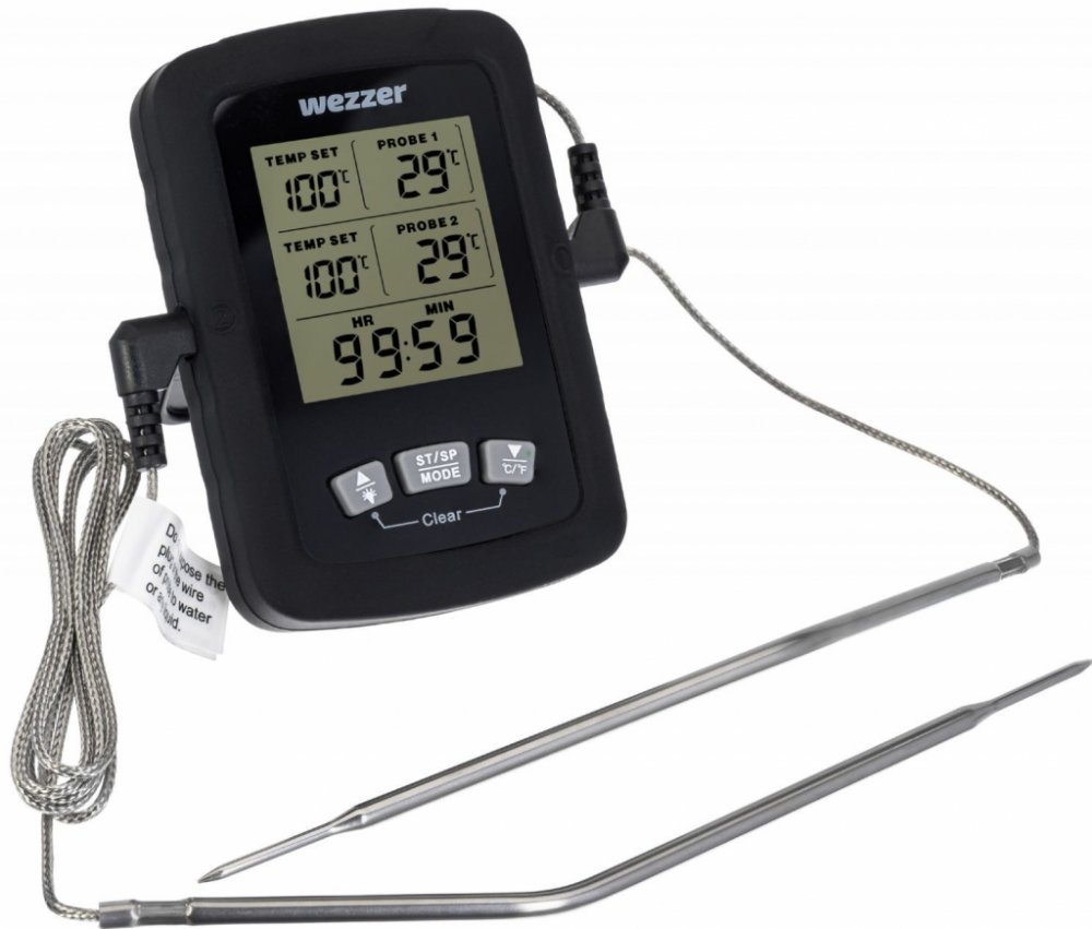 Teploměr Levenhuk Wezzer Cook MT60 s časovačem a dvěma termosondami na ohebných kabelech je velmi užitečným přístrojem pro vaření. Můžete měřit teplotu dvou pokrmů, které se vaří na různých místech současně. Jeden může být například na sporáku a druhý na grilu. Díky možnosti nastavení alarmu překročení teploty vás teploměr může informovat, pokud teplota při pečení překročí požadovanou hodnotu. Tímto způsobem zabráníte připečení masa nebo nadměrnému vysušení pečiva. K dispozici je také vestavěný časovač.