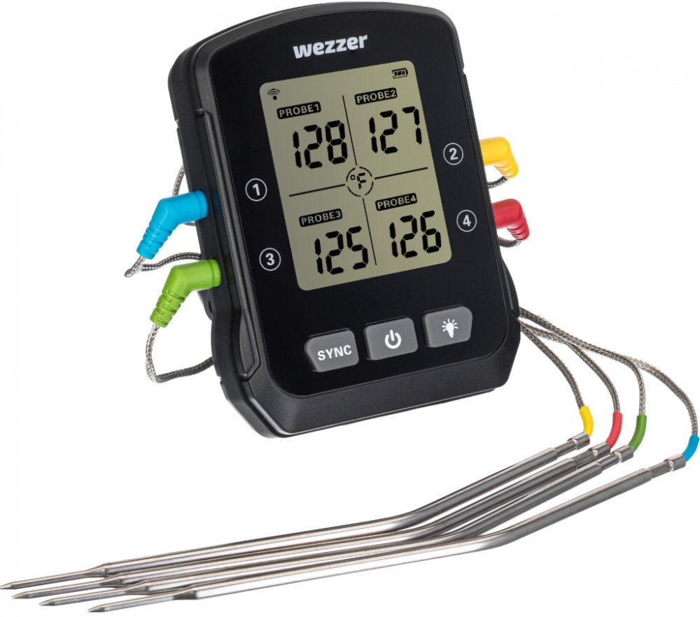 Levenhuk Wezzer Cook MT90 je pokročilý model teploměru na vaření se čtyřmi termosondami. Každá termosonda je připojena k 1 m dlouhému ohebnému kabelu. Přístroj dokáže měřit teplotu několika připravovaných pokrmů najednou a nezáleží na tom, kde je pokrm umístěn: v troubě, na sporáku nebo na grilu. Údaje se viditelně zobrazují na vestavěné obrazovce: číslice jsou velké a kontrastní, navíc je zabudováno podsvícení.