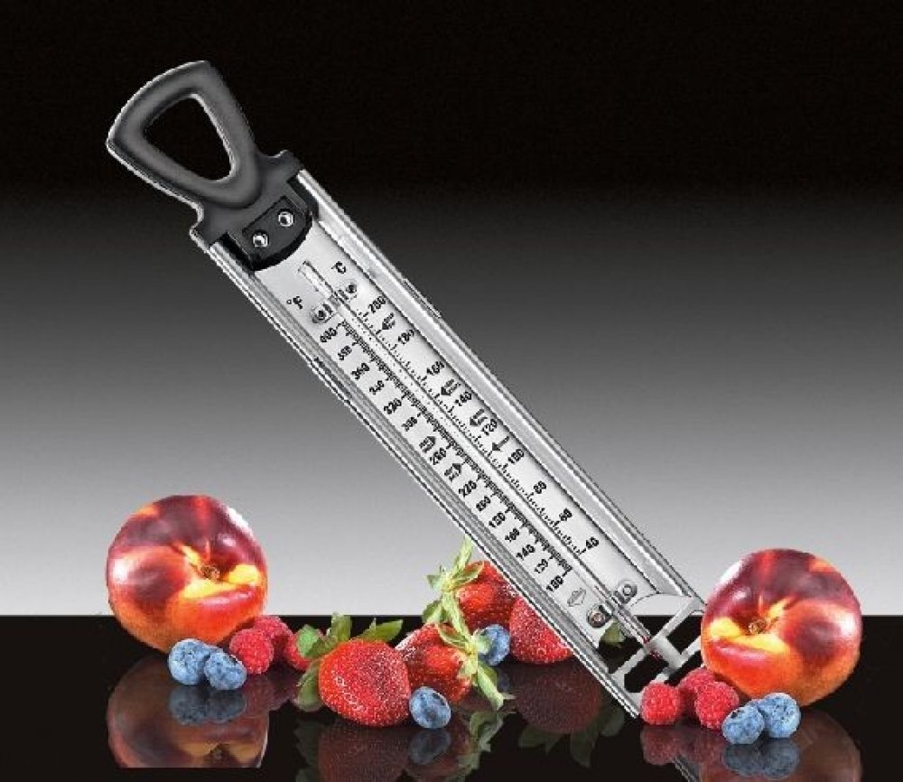 Ze zadu teploměru je svorka pro uchycení na zavařovací hrnec.