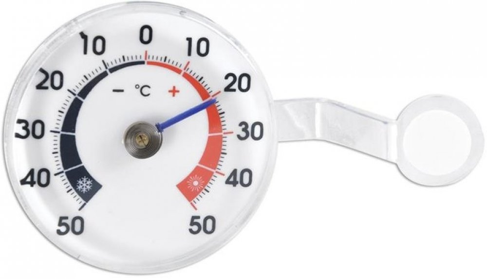 Mechanický venkovní teploměr z plastu, připevněný samolepkou na okno, s rozsáhlou stupnicí od -50 °C do 50 °C a snadnou instalací.