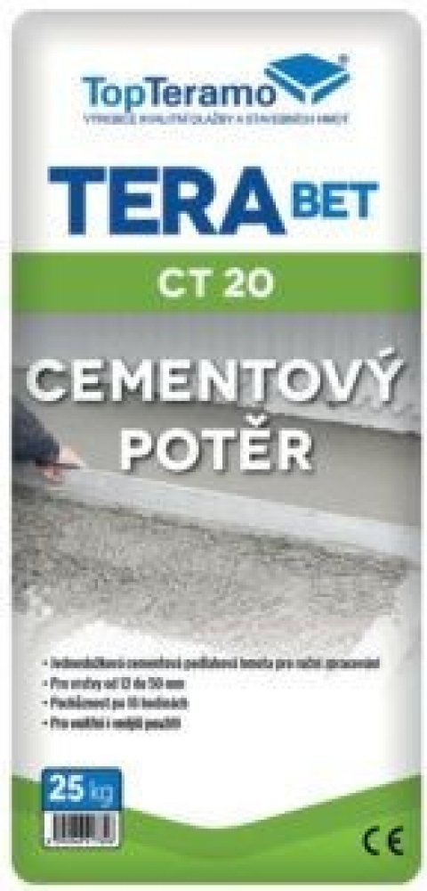 TOPTERAMO Cementový potěr TERABET® CT20 25kg (zr.4mm)je jemnozrná suchá betonová směs pro vytváření potěrů před podkládáním podhlahových krytů. Je dodávána ve formě šedého zrnitého prášku se zrnitostí do 4 mm. Obsahuje cement, jemnozrná plniva a modifikující přísady.Použití:Potěrová směs TERABET CT20 je určena pro přípravu a vytváření sdružených potěrů o tloušťce 12 až 50 mm na podkladní betonové mazaniny v interiéru i esteriéru staveb. Povrch takto vytvořeného potěru je určen pro pokládku podlahových krytů jako jsou dlaždice, parkety, plovoucí podlahy. Pro tenkovrstvé krytiny, koberce je nutno porch potěru opatřit vyhlazovací stěrkou. Příprava a zpracování:Potěrová malta se připraví vmícháním obsahu balení, tj. 25 kg suché směsi v 3 - 3,3 l vody ve spádové míchačce nebo v nádobě na maltu pomaloběžným spirálovým míchadlem. Doporučená doba mísení je 3 - 5 minut. Zamíchaná homogenní potěrová malta se rozprostře na připravený podklad v doporučené tloušťce hladítkem, urovná latí nebo vibrační latí a uhladí ocelovým hladítkem nebo hladičkou. Teplota vzduchu, materiálu a podkladů nesmí během zpracování a tuhnutí klesnout pod +5°C. Čestvě provedené plochy udržujte po 2 dny ve vlhkém stavu. Potěr je pochůzný po 16 hodinách.Technické parametry:- Zrnitost < 4 mm- Pevnost v tlaku po 28 dnech > 20 Mpa- Pevnost v tahu za ohybu po 28 dnech > 4 MPa- Doporučená tloušťka vrstvy 12 - 50 mm- Objemová hmotnost vyzrálého potěru 2080-2200 kg/m3- Množství záměsové vody 3- 3,3 l- Reakce na oheň třída A1- Spotřeba cca 2kg/m2/mm