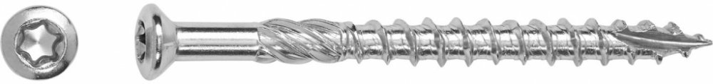 Terasové vruty Terasové vruty se používají pro montáž dřevěných teras, pergol, altánů a dalších venkovních dřevěných konstrukcí. Jsou speciálně navrženy pro použití s terasovými prkny a zajišťují pevný a estetický spoj. Vruty s čočkovou hlavou Čočková hlava je typ hlavy šroubu nebo vrutu, která je charakteristická svým zaobleným, polokulovitým tvarem připomínajícím čočku. Vruty s čočkovou hlavou mají kónickou spodní část, díky níž zapadnou do materiálu. Na rozdíl od zapuštěné hlavy, mají ale horní část vypouklou ve tvaru čočky. Používají se v případech, kdy je potřeba, aby šroub nevyčníval na povrch materiálu a zároveň nebyl kompletně zapuštění, případně tam, kde je žádoucí estetický vzhled. Drážka TX (TORX) Drážka TX odkazuje na drážku ve tvaru šestiramenné hvězdice se zaoblenými paprsky, která slouží k přenosu utahovacího momentu. Jde o typ drážky v hlavě šroubu, do které se zasouvá bit (nástavec šroubováku) stejného tvaru. Drážka TX je známá pro svůj dobrý přenos síly s spolehlivost při utahování, díky většímu množství záběrových ploch. Odolává opotřebení a nekroutí se. Nerezová ocel A2 Ocel A2 je nejčastěji používaný typ nerezové oceli pro výrobu spojovacího materiálu, jako jsou šrouby, matice, nýty a vruty. Je oblíbená pro svou dobrou odolnost proti korozi v běžných atmosférických podmínkách a v prostředí s vlhkostí, oxidačních a organických kyselin a mnoha alkalických roztoků. Není však vhodná pro prostředí s neoxidačními kyselinami a chlórem, jako jsou bazény nebo mořská voda.