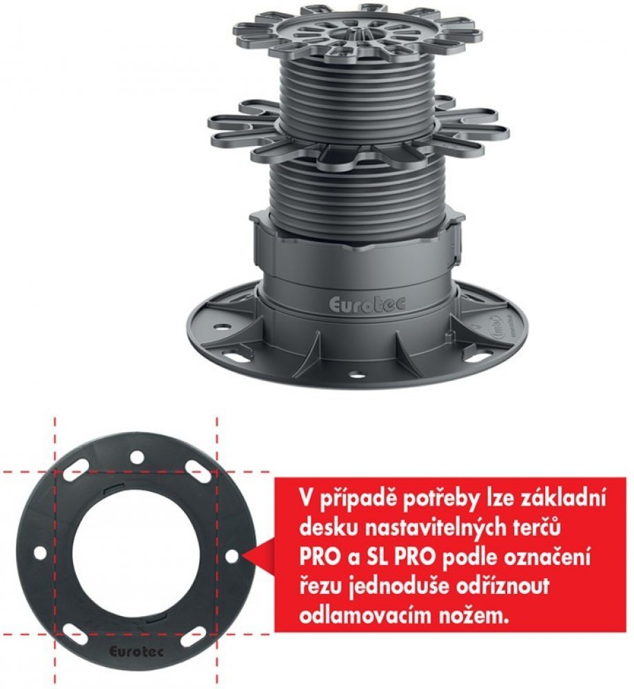 Výškově nastavitelné podkladní terče z tvrdého plastu jsou určeny pro pokládku dřevěných teras a vytvářejí svým rozmístěním pod dřevěné terasy podlahový rošt. Zajistí vyrovnání svažitého podkladu i podlahové nerovnosti.