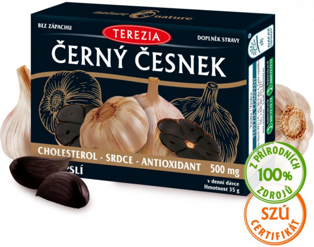 ČERNÝ ČESNEK je v tradiční medicíně vzácností. Jedná se o česnek kuchyňský (Allium sativum), který je umístěn do speciální komory se specifickou a přesně zvolenou teplotou a vlhkostí, kde po dobu několika týdnů fermentuje, čímž získá svou typickou černou barvu. Proč to všechno? Česnek přirozeně pomáhá udržovat normální hladinu cholesterolu a tuků v krvi. Dále podporuje normální funkci srdce a cév a pomáhá při pocitu těžkých nohou. Působí také jako antioxidant a posiluje imunitní systém. Fermentace znásobuje jeho účinky a navíc česnek zbaví nepříjemného zápachu a štiplavé chuti. Každá kapsle tohoto doplňku stravy představuje 1 stroužek čerstvého (bílého) česneku.