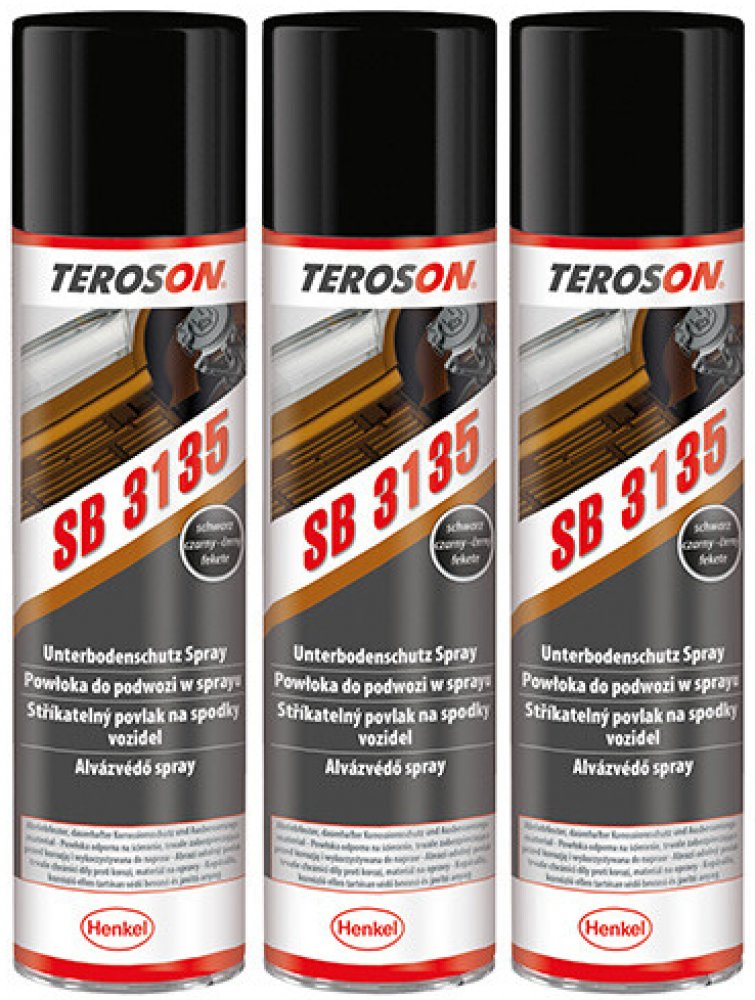 Teroson SB 3135 - 500 ml černý USB sprejTEROSON SB 3135 BKPotahový materiál pro trvale elastickou ochranu proti abrazi a korozi, s vysokou odolností proti stárnutí, určen pro ochranu spodku vozidel.Vlastnosti produktu:·Ideální ochrana spodku vozidel·Slučitelný s povrchem většiny OEM nátěrů·Vhodné pro bodové opravy·Tlumí vibrační zvuky·Velmi vysoký obsah pevných látek·Vynikající odolnost proti oděru·Tento produkt je nedílnou součástí produktů používaných při opravách a údržbě všech typů vozidel.TEROSON® SB 3135 je černý nátěr pro podvozky na bázi pryže a pryskyřice bez asfaltu, který lze nanášet štětcem nebo stříkáním. Umožňuje vytvořit permanentně elastickou, vysoce adhezivní ochrannou vrstvu, která podvozek chrání před korozí a vymrštěnými kamínky. Vyznačuje se vynikající odolností proti oděru a rychlým schnutím s dobrou přilnavostí.