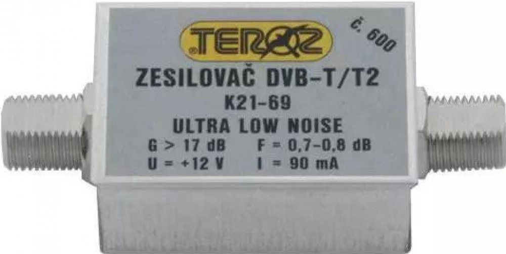 Anténní zesilovač Teroz 600X, nízkošumový, UHF, G17dB, F0,7dB, U>120dBµV, F-F