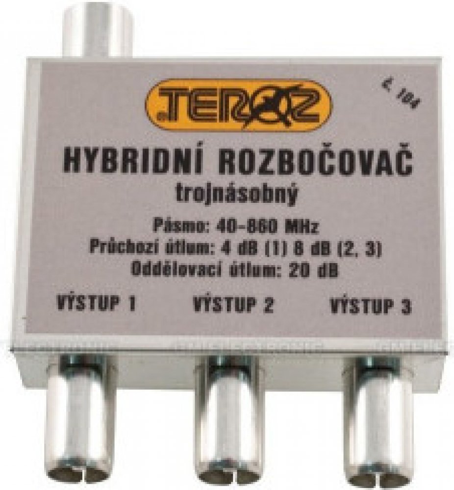 TECHNICKÉ PARAMETRY * Rozbočovač TV trojnásobný hybridní * IEC konektory * 1 vstup, 3 výstupy (1x4dB, 2x8dB) * V pásmu 40-862MHz * Průchozí útlum: 1 x 4 dB, 2 x 8dB * Oddělovací útlum: 20 dB (40 dB) * Rozměr krabičky: 42 x 57 mm * Průchozí pro napájení