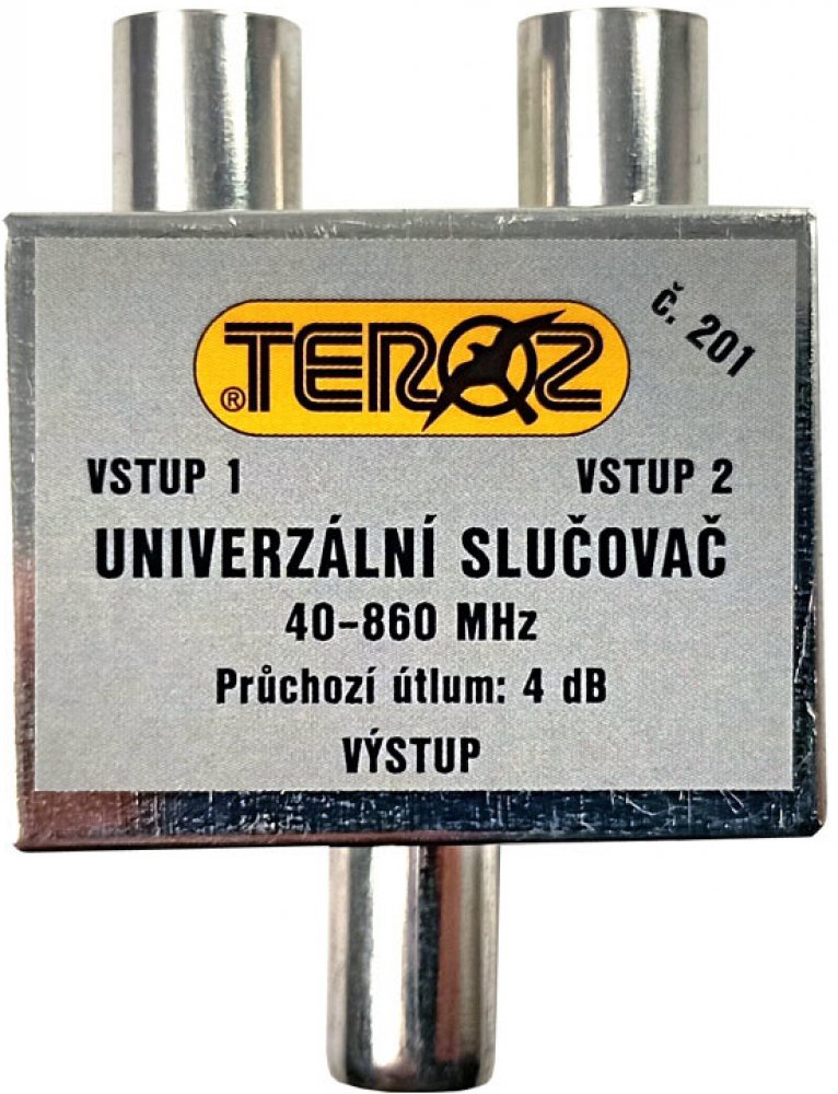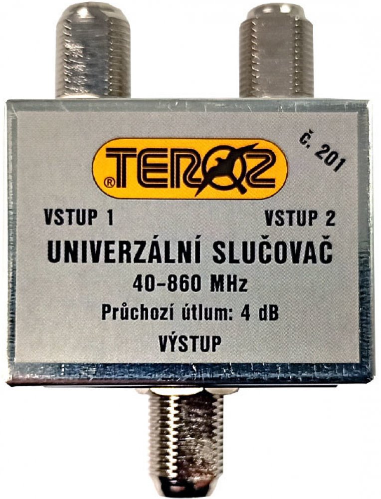 TECHNICKÉ PARAMETRY * Univerzální feritový slučovač * IEC konektory * 1 výstup, 2 vstupy * V pásmu 40 – 862 MHz * Průchozí útlum: 3,5 – 4 dB * Oddělovací útlum: 11 dB * Rozměr krabičky: 40 x 30 mm * Průchozí pro napájení * Používá se ke sloučení kmitočtově blízkých signálů v pásmu 40-860MHz nebo výstupu SAT přijímače s TV signálem apod.