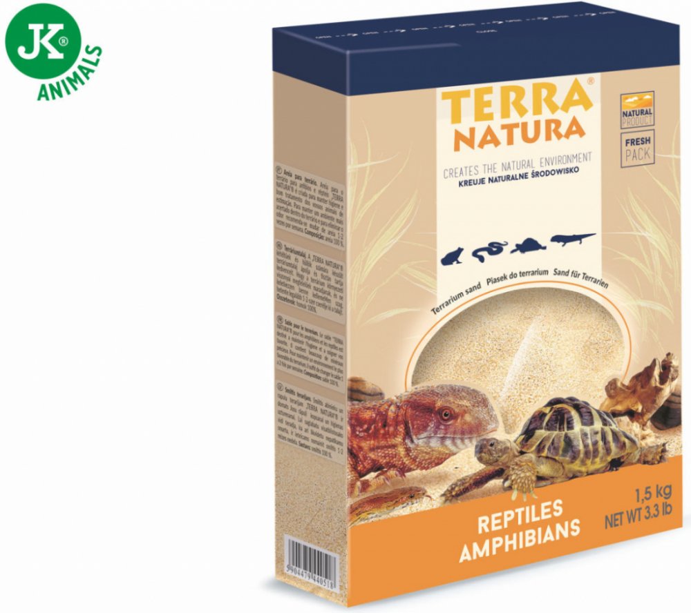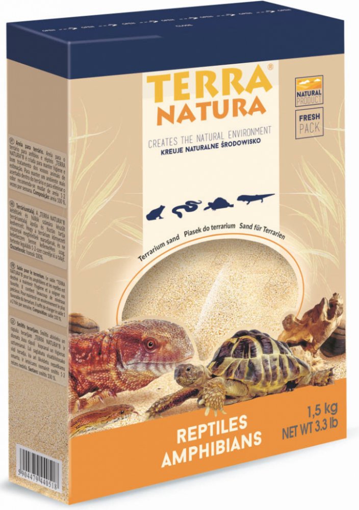 Písek do terária Terra Natura, 1,5 kg. Písek vytváří v teráriu přírodní prostředí pro živočichy. Písek pro plazy a hady Terra Natura je určen k udržování hygieny a k péči o Vaše mazlíčky v teráriu. Písek obsahuje mnoho ušlechtilých minerálů. Díky jeho dezinfekčním prostředkům likviduje nepříjemný zápach v místnosti. Pro udržení co nejvhodnějšího prostředí v teráriu je nutno písek měnit 1 až 2 krát týdně.