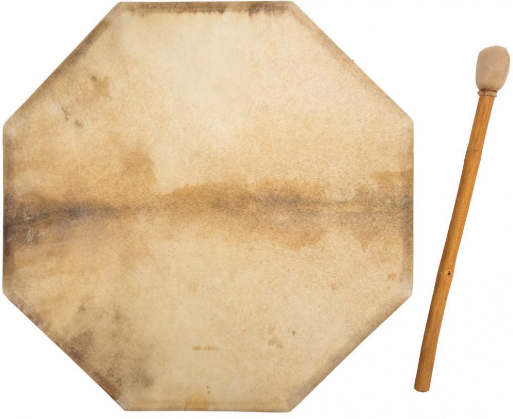 Šamanský buben disponující 8-hranný dřevěnou konstrukcí, průměru 50 cm. Blána je vyrobena z pravé kůže. Disponuje plným bohatým zvukem, s výraznými basovými frekvencemi. Palička je součástí balení.