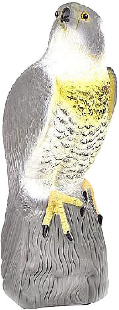 Model sokola sedícího na kameni pomáhá plašit drobné ptáky, jako jsou holubi, sýkorky nebo drozdi, a tím pomáhá chránit úrodu nebo budovy před nežádoucím ptačím trusem. Ideálním místem pro umístění sokola je střecha budovy, fontána nebo zahradní altán. Je vyrobena z vysoce kvalitního plastu, díky čemuž je odolná vůči UV záření a přispívá k její autentičnosti.
