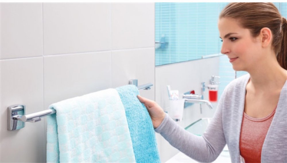Věšák na ručník tesa® Klaam představuje krásně navržené místo pro ukládání a sušení ručníku. Díky chromovanému povrchu s vysokým leskem na kovovém základním materiálu je tato hranatá tyč jak nerezová, tak voděodolná. Pro připevnění ručníku není použito vrtání, místo toho je použito lepidlo. Znamená to, že stěny a obklady zůstanou nepoškozené. Lepidlo zasychá za 12 hodin.