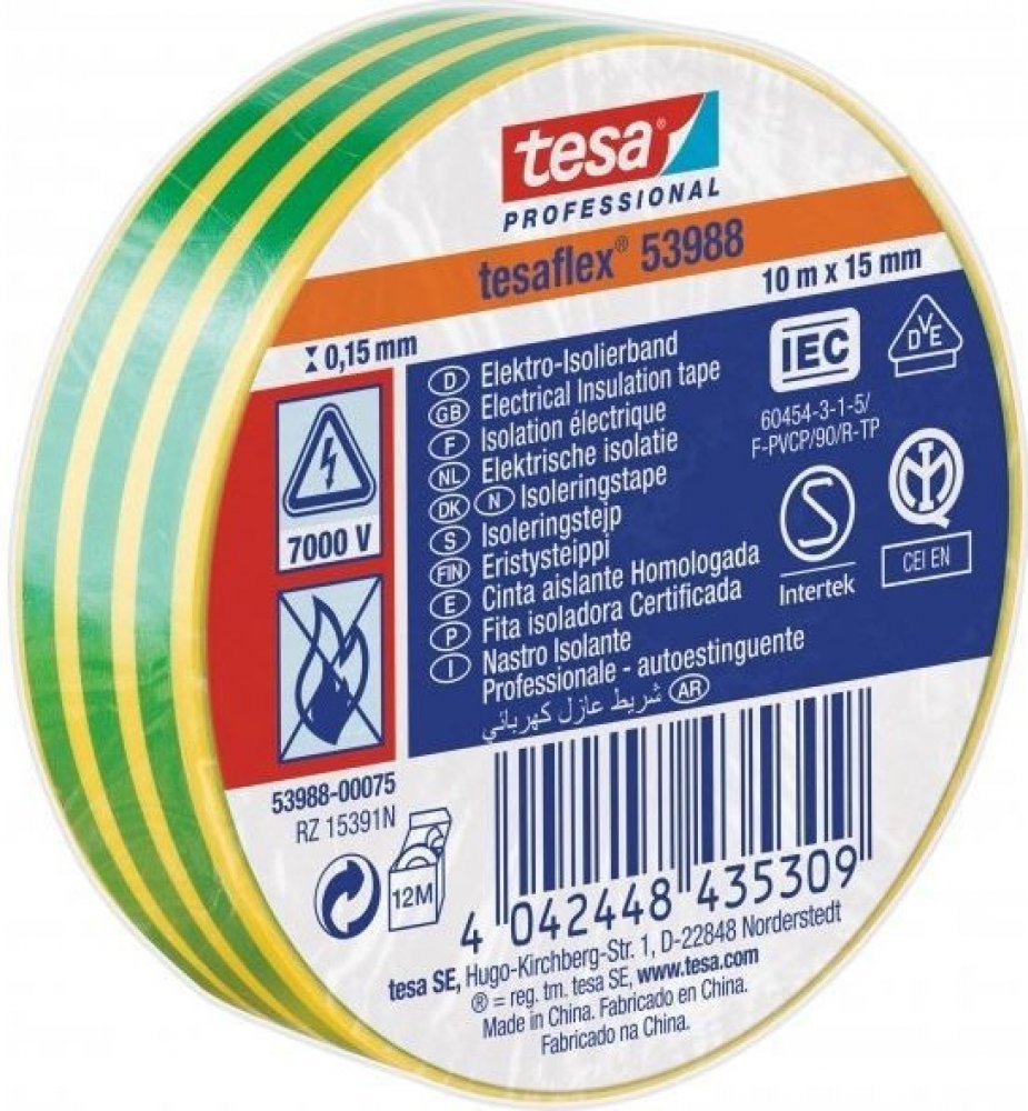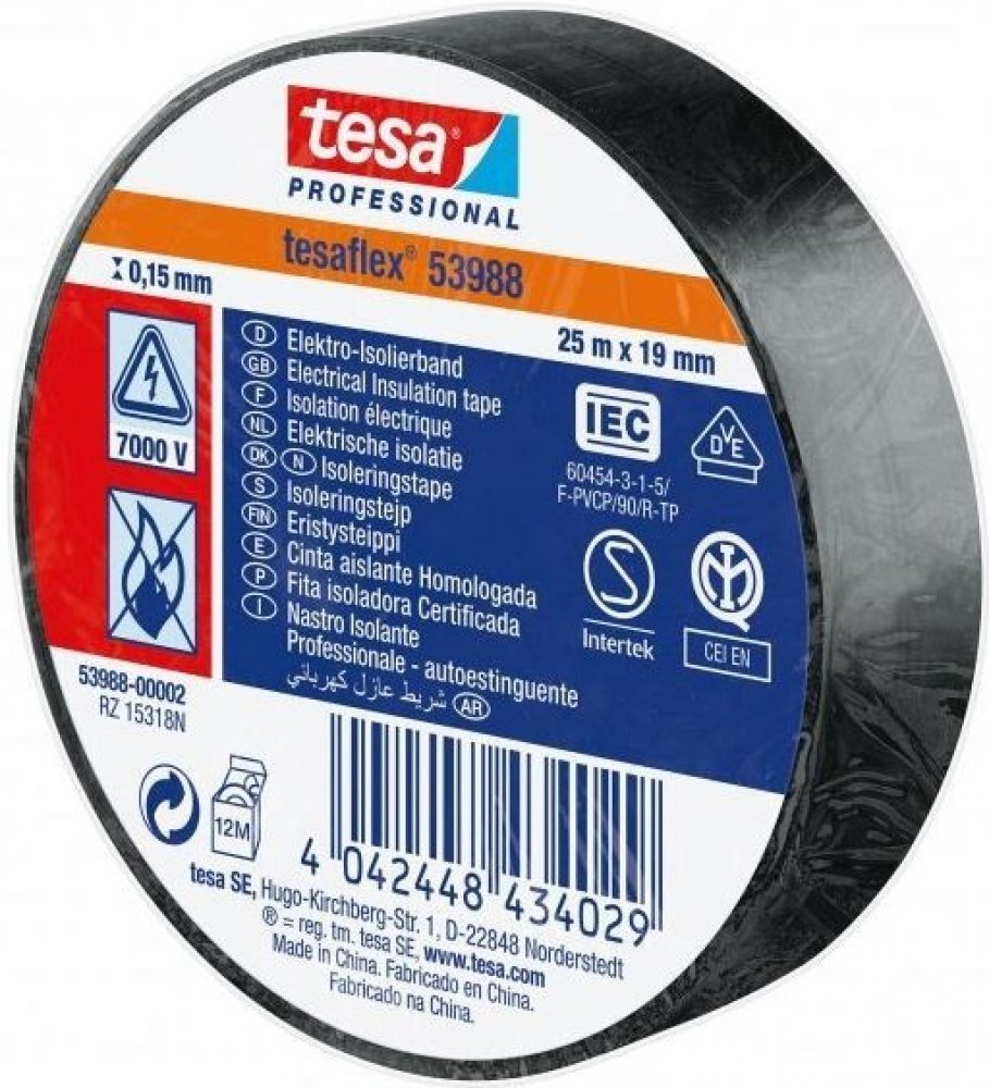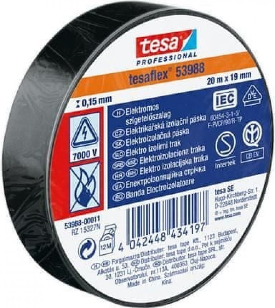 Izolační páska Tesa 53988 PVC 15/10 m černá Tesaflex® 53988 / IEC je speciálně vytvořená páska z ohnivzdorného měkčeného PVC s dobrou přilnavostí a pružností pro použití při nízkých teplotách. Tesaflex ® 53988 je vhodná pro drátové a kabelové izolace, svazkování a značení, posilování, těsnění a ochranu. Použité změkčovadlo v pásce je vhodné k použití s většinou elektroinstalačních systémů. Modifikované kaučukové lepidlo pásky tesaflex ® IEC 53988 je ideální pro aplikace elektrických izolací. Technické parametry Materiál nosiče měkčené PVC. Druh lepidla: přírodní kaučuk. Tloušťka pásky: 150 µm. Šířka: 15 mm. Návin: 10 m. Barevné provedení: černá. Přilnavost na ocel: 2,7 N/cm. Protažení do přetržení: 260 %. Síla přetržení: 32 N/cm. Průraznost: 7000 volt. Odolává teplotám až do 90°. Cena za 1 ks pásky Tesa.