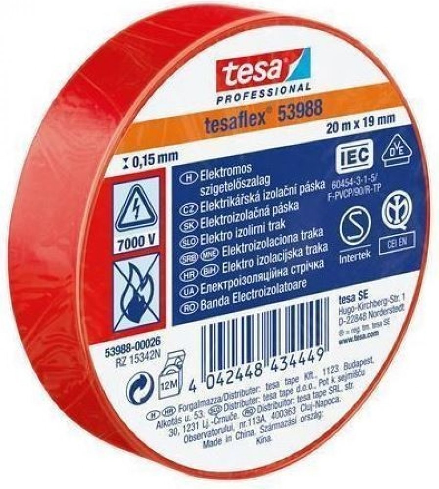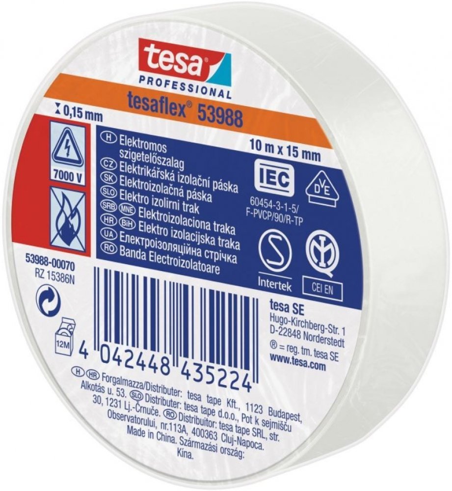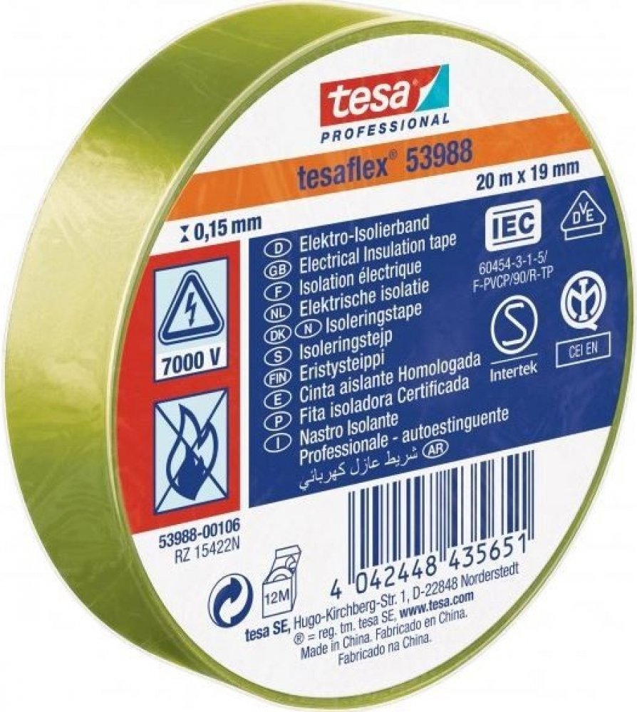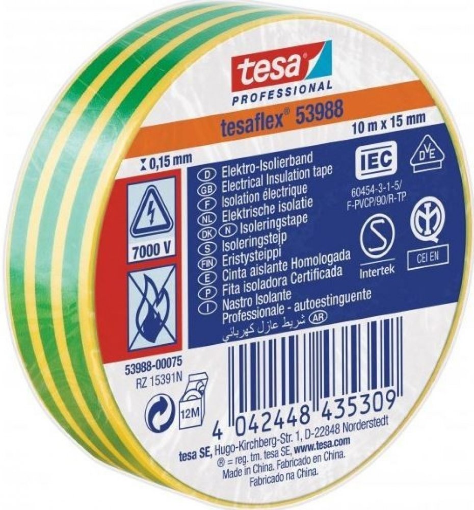 Izolační páska Tesa 53988 PVC 15/10 m černá Tesaflex® 53988 / IEC je speciálně vytvořená páska z ohnivzdorného měkčeného PVC s dobrou přilnavostí a pružností pro použití při nízkých teplotách. Tesaflex ® 53988 je vhodná pro drátové a kabelové izolace, svazkování a značení, posilování, těsnění a ochranu. Použité změkčovadlo v pásce je vhodné k použití s většinou elektroinstalačních systémů. Modifikované kaučukové lepidlo pásky tesaflex ® IEC 53988 je ideální pro aplikace elektrických izolací. Technické parametry Materiál nosiče měkčené PVC. Druh lepidla: přírodní kaučuk. Tloušťka pásky: 150 µm. Šířka: 15 mm. Návin: 10 m. Barevné provedení: černá. Přilnavost na ocel: 2,7 N/cm. Protažení do přetržení: 260 %. Síla přetržení: 32 N/cm. Průraznost: 7000 volt. Odolává teplotám až do 90°. Cena za 1 ks pásky Tesa.