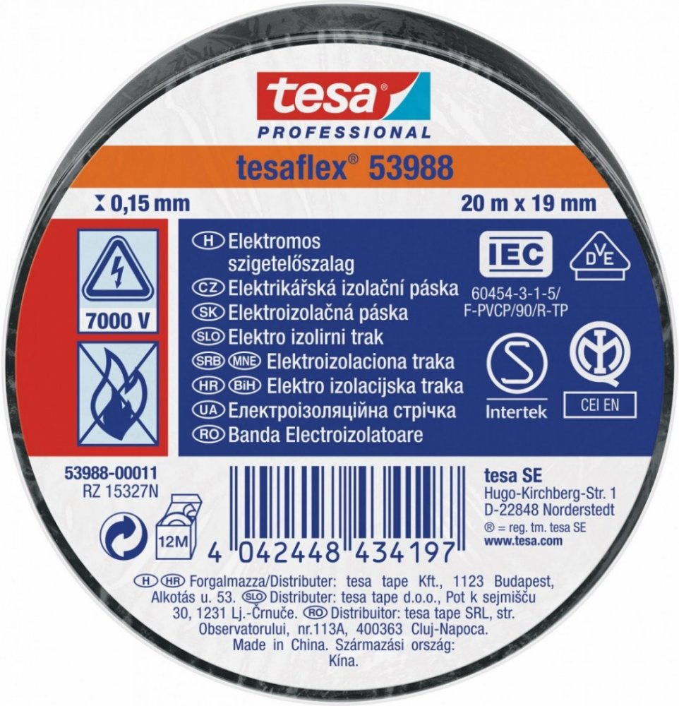 Elektroizolační páska z ohnivzdorného měkčeného PVC s dobrou přilnavostí a pružností pro použití při nízkých teplotách.* Použité změkčovadlo v pásce je vhodné k použití s většinou elektroinstalačních systémů. * Modifikované kaučukové lepidlo pásky tesaflex ® IEC 53938 je ideální pro aplikace elektrických izolací. * Vhodná pro drátové a kabelové izolace, svazkování a značení, posilování, těsnění a ochranu. * Splňuje specifikaci IEC 454-3-1 .* Délka 20 m : šířka 19 mm