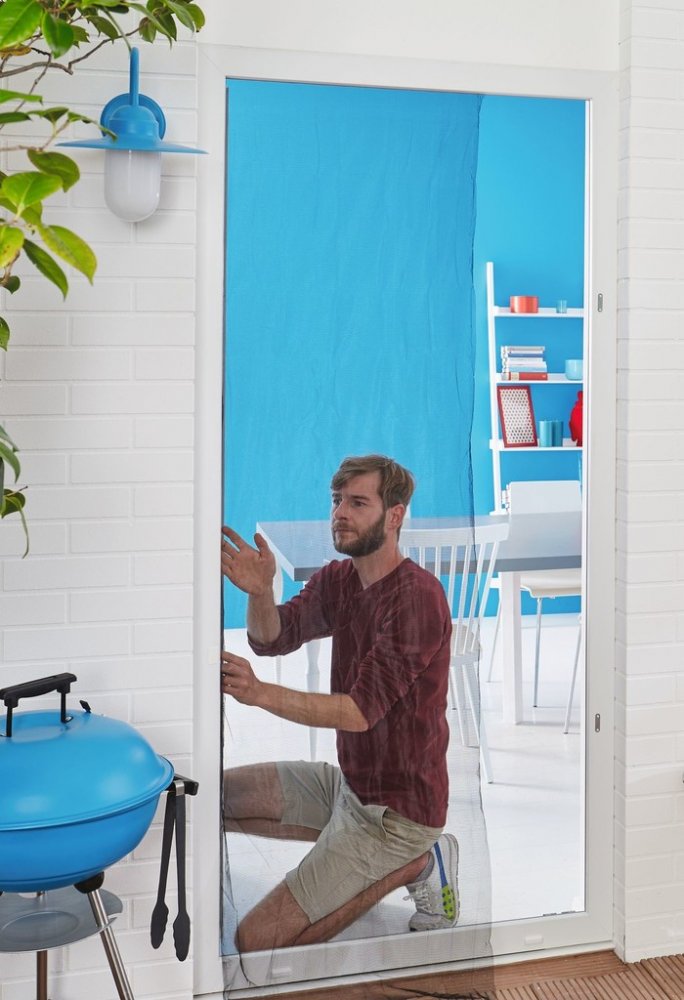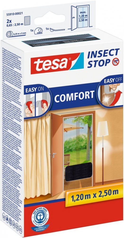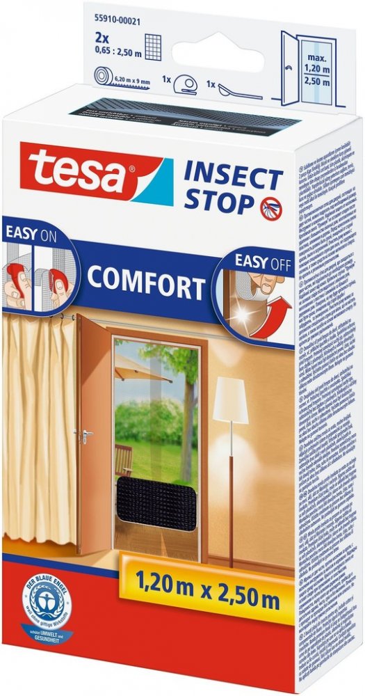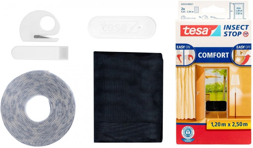 Balení sítě Tesa COMFORT navíc obsahuje praktickou přítlačnou špachtli pro pohodlnou instalaci sítě do více oken najednou. Díky ní si při nasazování sítě do suchého zipu neotlačíte bříška prstů. Dále je v tomto balení přiložen i řezací nožík pro snadné odříznutí přebytečné síťoviny či upravení správného rozměru pro menší okna. Síť díky své struktuře nepropustí žádný hmyz, a přitom nebrání přístupu světla a vzduchu. Snadno se instaluje, nepřekáží při otevírání a zavírání dveří. V případě potřeby se jednoduše upraví na menší rozměr dveří. Po odstranění nezanechává stopy na rámu. Není náročná na údržbu, jen se omyje a uschová, protože je určena k opakovanému použití. Instalace vyčistěte vnitřní rám dveří čisticím prostředkem nebo lihem oboustrannou pásku přilepte na tři strany vnitřního rámu (vlevo, vpravo, nahoře) a na několik vteřin pevně přitlačte přiložte sít na pásku k horní části rámu tak, aby se obě poloviny sítě ve středu dveří alespoň 10 cm překrývaly pomocí speciálních závaží, která jednoduše připevníte na spodní část sítě, zabráníte nežádoucímu pohybu a rozevírání sítě odstřihněte přečnívající materiál po krajích Barvy bílá antracitová