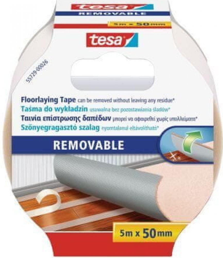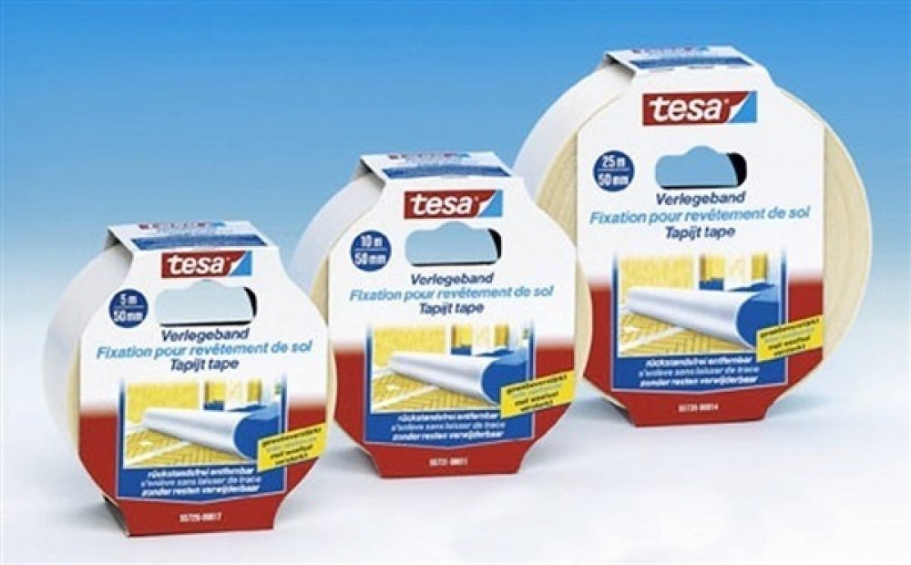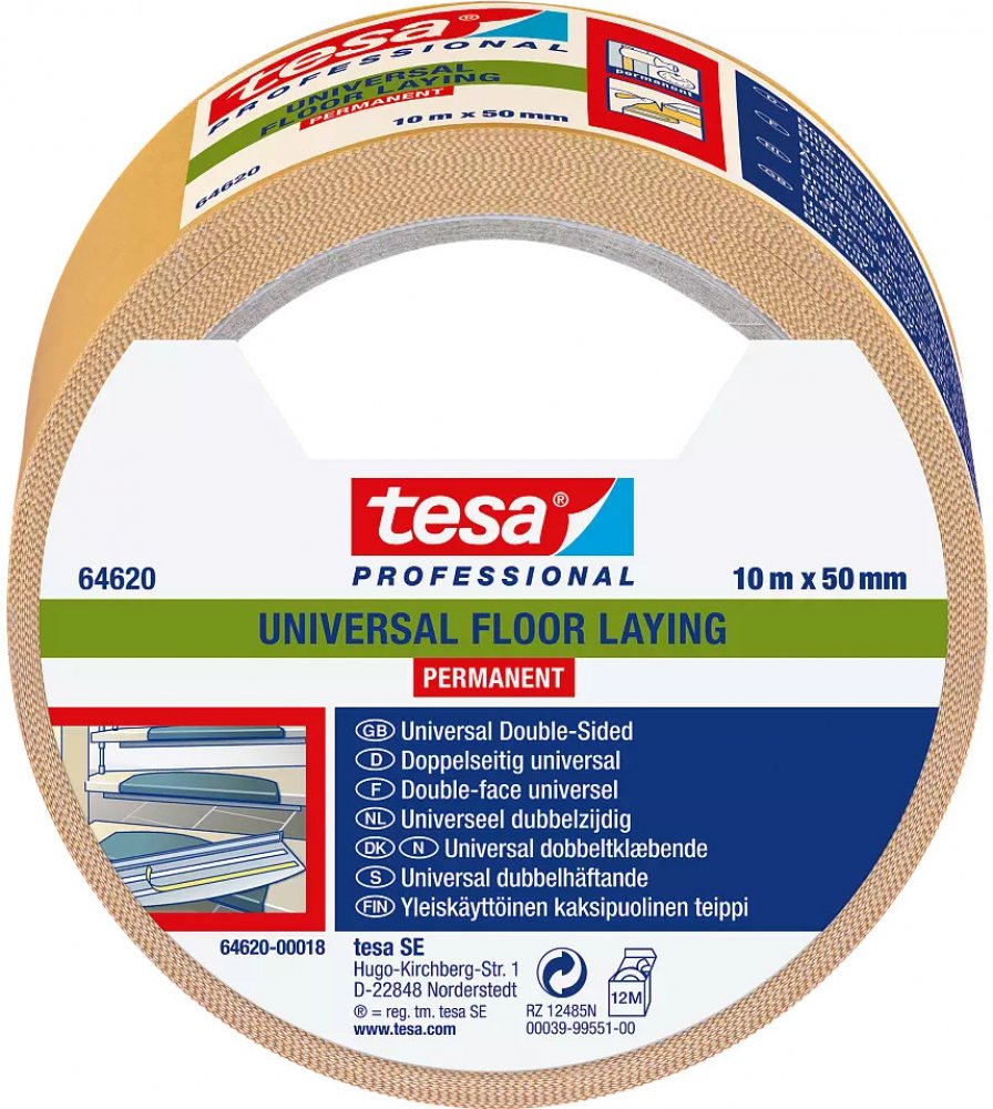 Oboustranná podlahová páska tesa® s extra silnou přilnavostí je extrémně odolná, určena výhradně pro zátěžové podlahové krytiny a kryté venkovní objekty.