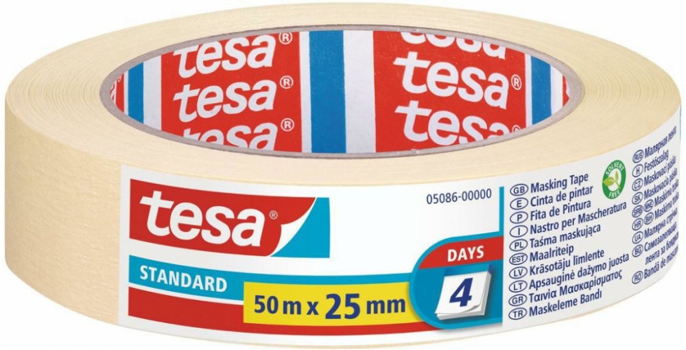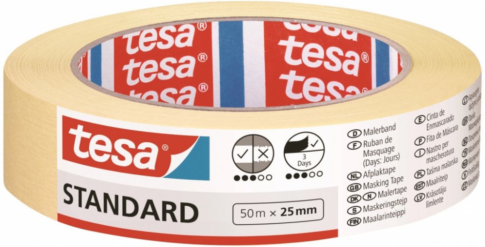 Papírová maskovací páska tesa STANDARD je multifunkční zakrývací páska, která by neměla chybět při malování či renovacích domova. Je vyrobena z papíru pro snadnou likvidaci a je k dispozici v různých šířkách. Každá z nich se hodí pro jinou situaci. I přes svou dobrou přilnavost lepidla ji lze po použití snadno odstranit do 3 dnů bez zanechání stop lepidla.