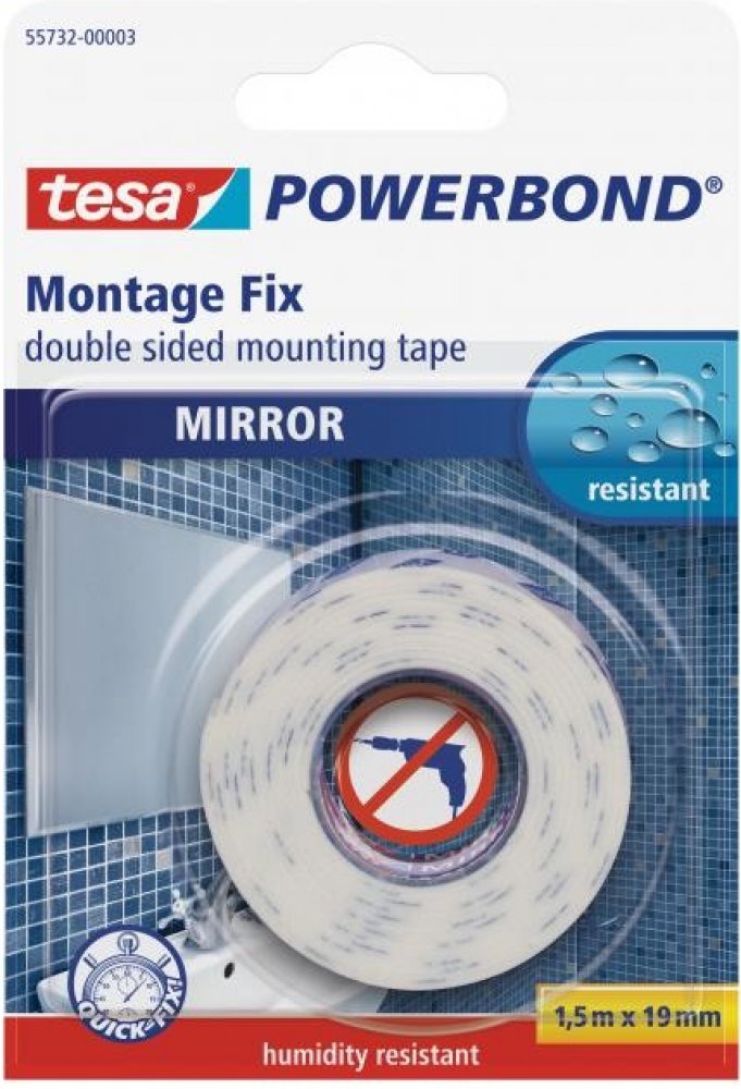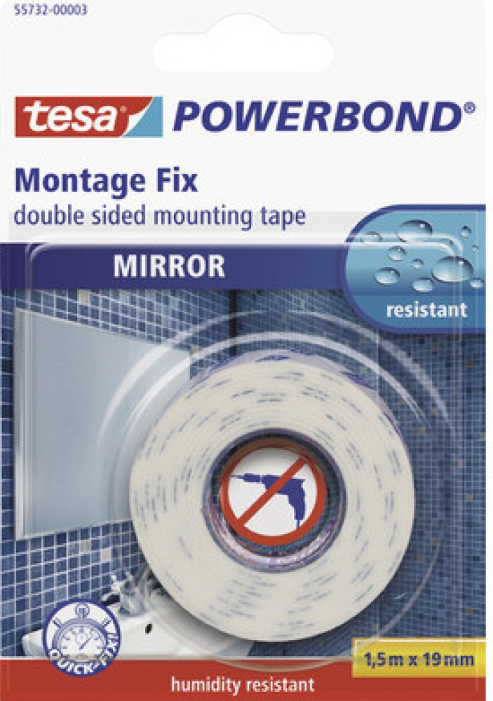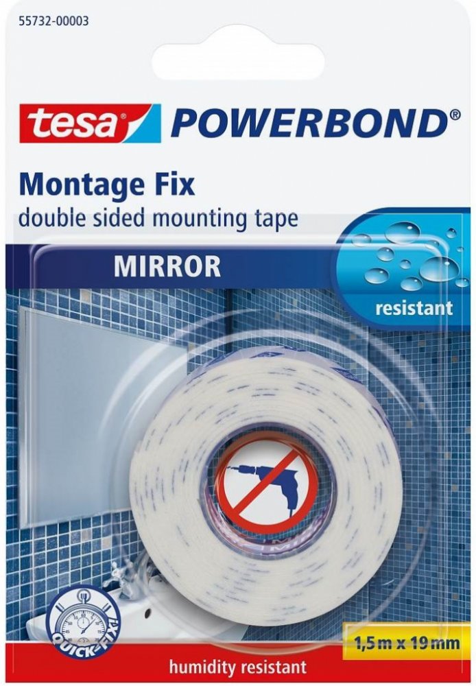 Montážní páska tesa® Powerbond® MIRROR na zrcadla je oboustranná samolepicí páska, která má obzvláště silnou přilnavost dokonce i v místnostech s vyšší tvorbou vlhkosti, jako jsou koupelny či kuchyně. Udrží zrcadla o rozměrech 70 x 70 cm a tloušťce až 4 mm. Zapomeňte na nepořádek a námahu spojenou se zatloukáním hřebíků či vrtání děr pro šrouby do kachliček. S touto speciální páskou bezpečně připe...