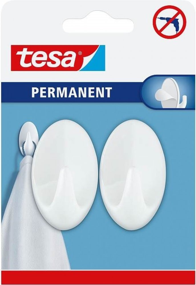 Samolepicí tesa® Permanent háčky bílé, oválné se hodí vždy, když potřebuje zavěsit lehčí předměty jako ručníky, utěrky a drobné kuchyňské nebo koupelnové doplňky a mít je stále po ruce. Jsou vyrobeny z bílého plastu, který jim propůjčuje decentní vzhled. Jsou vybaveny samolepicí zadní stranou, což umožňuje jejich trvalou fixaci na většinu hladkých povrchů, jako jsou obklady, sklo, dřevo a jiné hladké materiály 1 . Jejich hlavní výhodou je snadné připevnění během okamžiku, bez použití nářadí nebo vrtání.