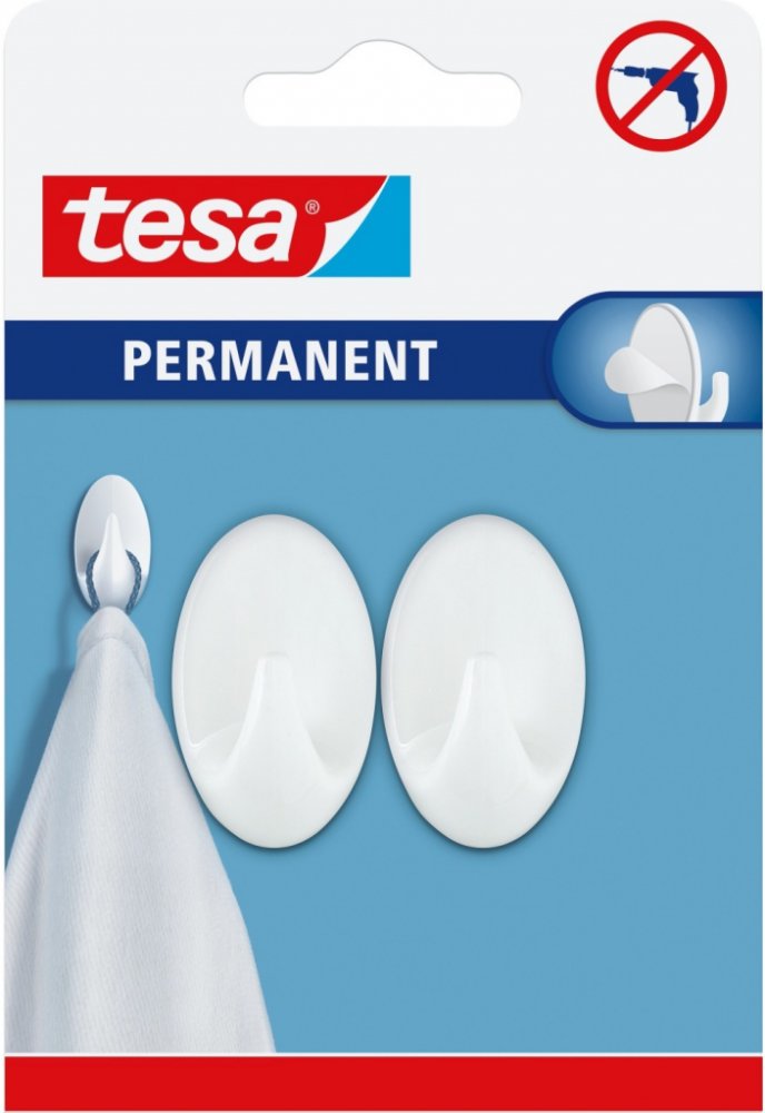 Samolepicí háčky tesa Permanent představují moderní háčky pro náročné. Při použití v koupelně jsou ideální pro zavěšení ručníků. V kuchyni nebo kanceláři poslouží pro zavěšení všech lehčích předmětů, které díky tomu budete mít stále při ruce. Háčky mají samolepicí zadní stranu, která umožňuje instalaci bez nářadí na většinu hladkých povrchů. Nevhodné pro lepení na polystyren, pěnové hmoty, plochy s nelepivou úpravou, porézní materiály.