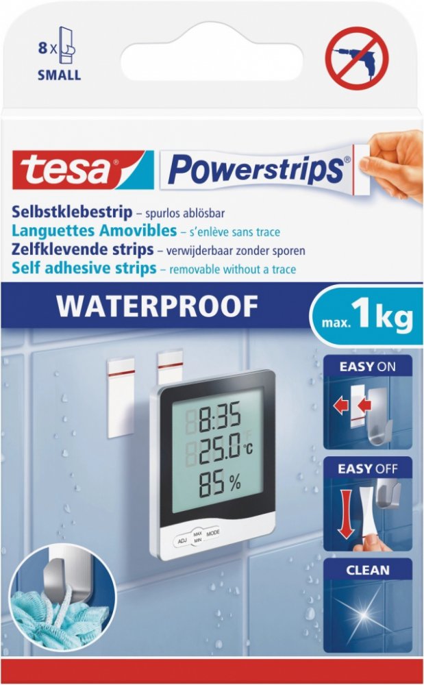 Vodotěsné pásky tesa Powerstrips S nabízejí praktické a všestranné řešení pro připevňování předmětů o hmotnosti až 1 kg na hladké povrchy, jako jsou dlaždice, sklo nebo plast v koupelně, aniž byste se museli uchylovat k vrtání otvorů nebo šroubů. Díky speciální voděodolné technologii Powerstrips jsou tyto lepicí pásky ideální pro použití ve vlhkých místnostech a vlhkých prostorách. Umožňují odstranění beze zbytků a nezanechávají na stěně žádné stopy. Ideální pro připevnění držáků na ručníky, dávkovačů mýdla nebo lehkých koupelnových pomůcek Inovativní design zajišťuje, že Powerstrips snadno odolá vlhkosti a vlhkosti, aniž by ztratily svou přilnavost. Proužky Powerstrips jsou speciálně navrženy pro dočasné použití a lze je v případě potřeby snadno odstranit bez poškození povrchu S vodotěsnými páskami tesa Powerstrips S získáte jednoduchou, čistou a flexibilní možnost upevnění, která je ideální pro použití v nájemních bytech, kde dochází k vrtání. často nejsou povoleny tyto lepicí pásy poskytují dokonalé řešení pro dočasné upevnění, aniž by došlo k ohrožení estetiky nebo funkčnosti povrchů. Jsou praktické zejména pro nájemníky, kteří nesmějí provádět žádné trvalé změny ve zdech.