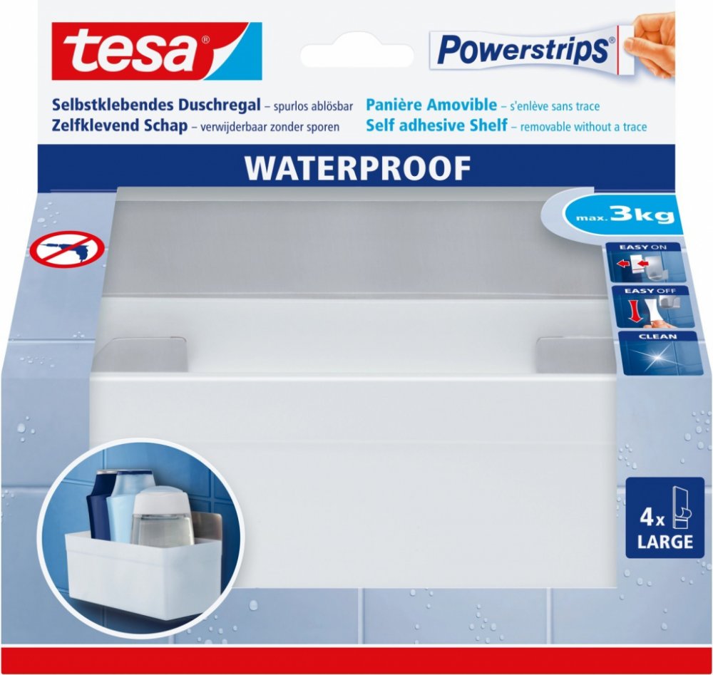 Samolepicí polička tesa Powerstrips WATERPROOF je univerzální hluboká polička pro použití v kuchyni a koupelně. Poskytuje bezpečný úložný prostor pro předměty až do celkové váhy 3 kg. Snadno se připevňuje na sklo, obklady a jiné hladké povrchy, a to bez vrtání. Nevhodné pro použití na polystyrenu, pěnových materiálech, površích s nepřilnavou vrstvou, porézním materiálu. Díky technologii Powerstrips Waterproof ji můžete použít jako poličku na kuchyňské prostředky, nebo ji klidně umístit přímo do sprchového koutu jako košík na kosmetické přípravky. Dopřejte si malého pomocníka, který vám usnadní život. Obsah balení výrobku: 1 košík, nerez a plast + 4 proužky Powerstrips Waterproof Přídržná síla: 3 kg