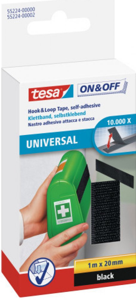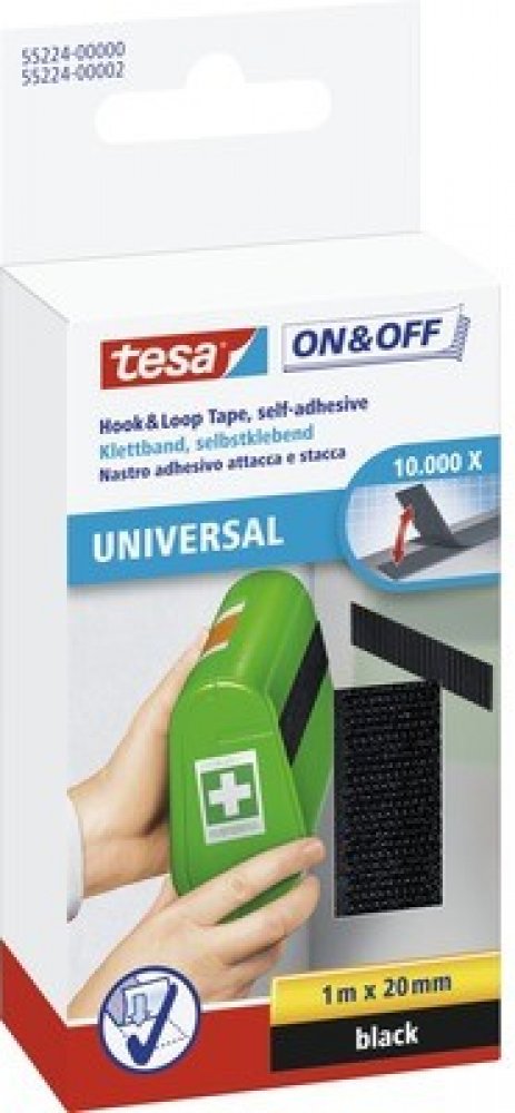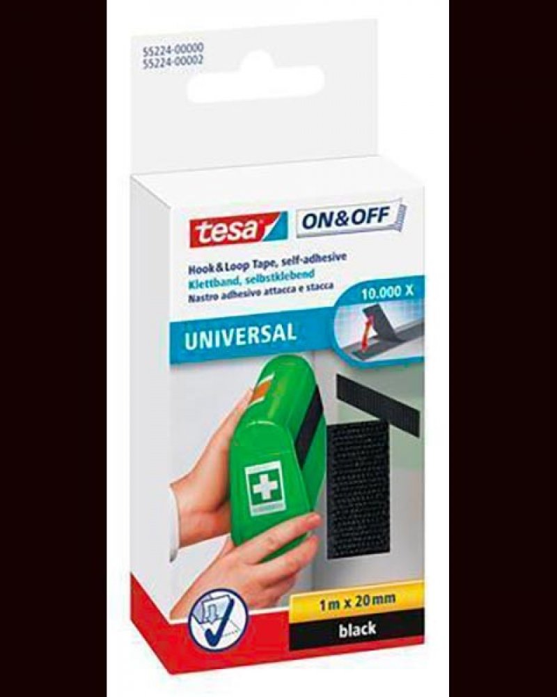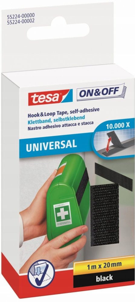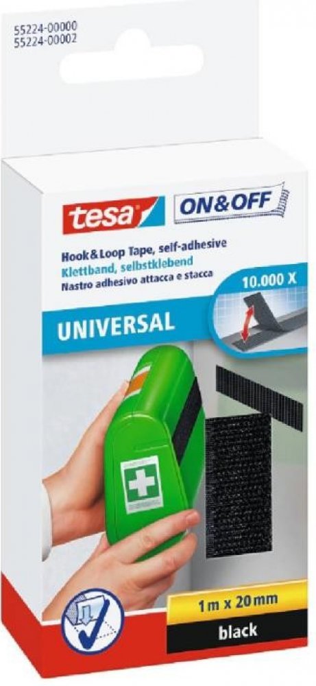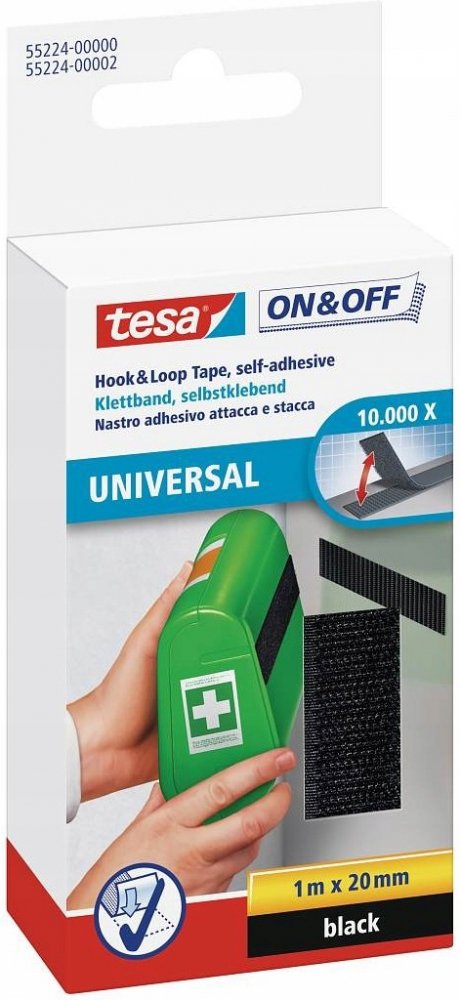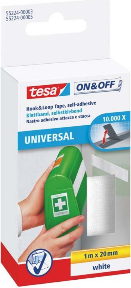 Samolepicí pás suchého zipu pro univerzální použití tesa® On & Off je všestranný pás suchého zipu a praktický pomocník pro organizaci doma i v kanceláři, kterého si rychle oblíbíte. Využijete jej k připevňování lehkých předmětů na zeď nebo jiný hladký povrch s možností sejmutí a opětovného zavěšení. Připevníte s ním například lékárničku na zeď nebo kuchyňské potřeby tak, abyste je měli vždy snadno...