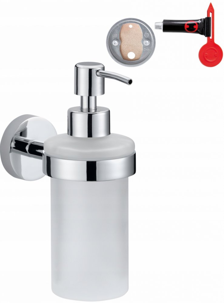 Samolepicí dávkovač mýdla na ruce, který nevyžaduje žádné vrtání. . Pochromovaný kov s vysokým leskem, zaoblené provedení, kruhová nástěnná podložka, saténové sklo. Spolehlivé připevnění, odolnost proti vodě, zaručeně nerezavějící. Funguje na obkladech, kovu, přírodním kameni, mramoru, betonu, dřevu, sklu a mnoha druzích plastů. Nefunguje na tapetách, omítce a jiných nepřilnavých površích. Lze ryc...