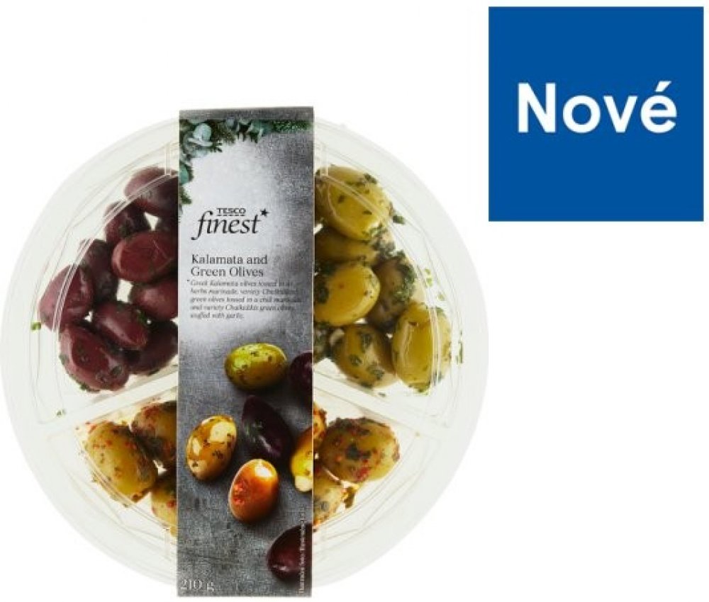Marinované zelené olivy odrůdy Chalkidikis bez pecek* (58 %) [zelené olivy, sůl, regulátory kyselosti (kyselina mléčná, kyselina citronová), antioxidant (kyselina L-askorbová)], Marinované olivy Kalamata s peckami (31 %) (olivy, sůl, ocet kvasný vinný), česnek (5 %), řepkový olej, byliny, chilli, *Může obsahovat kousky pecek