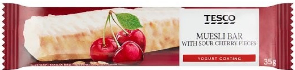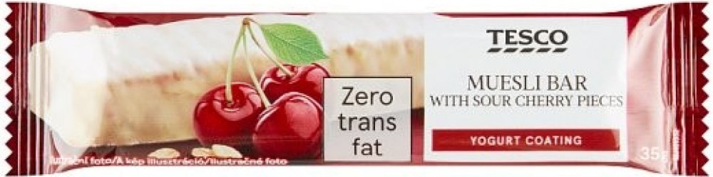 Škrobový sirup, Jogurtová poleva (26 %) [cukr, plně ztužený palmojádrový tuk, sušená syrovátka (mléko), sušený jogurt (2 %) (mléko), sušené odstředěné mléko, regulátor kyselosti (kyselina citronová), emulgátor (sójový lecitin), přírodní aroma, vanilkový extrakt], Ovesné vločky (15 %), Rozinky (rozinky, slunečnicový olej), Extrudovaná kukuřice, Sušená jablka, Pšeničné vločky, Palmový tuk, Višňové kousky (2 %) [koncentrované jablečné pyré, višňové pyré (10 %), fruktózo-glukózový sirup, glukózový sirup, cukr, zvhčující látka (glycerol), pšeničná vláknina, palmový tuk, želírující látka (pektiny), regulátor kyselosti (kyselina jablečná), přírodní aroma, potravina s barvícím účinkem (koncentrát z mrkve, koncentrát z černého rybízu, koncentrát z borůvek)], Sójová krupice, Emulgátor (sójový lecitin), Aroma